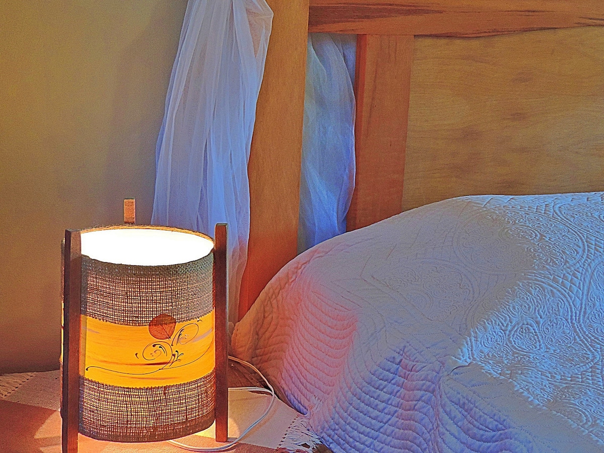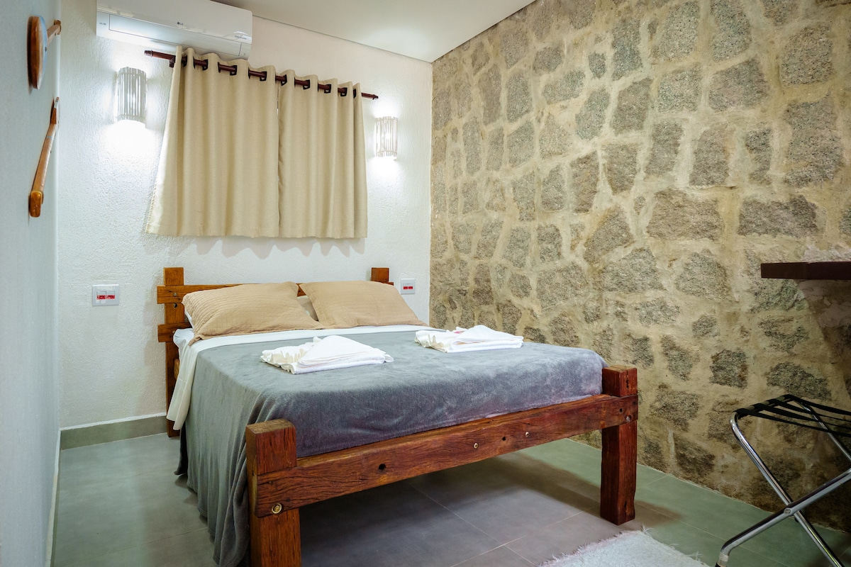 Casa dentro da pousada com 2 quartos, sala/cozinha, 2 banheiros, ar condicionado Split somente frio na sala e demais quartos ar condionado de parede , e ventilador de teto em todos ambientes. - Quarto 1 - Cama box de casal , tambem um mezanino com colchão sobre deck de madeira. -Quarto 2 - Cama box de casal INCLUSO: : Cafe da manha, piscina aquecida, academia, sauna, churrasqueira, roupa de cama, toalha, WIFI CUSTO ADICIONAL: Banheira, o furo, servico de massaagem
