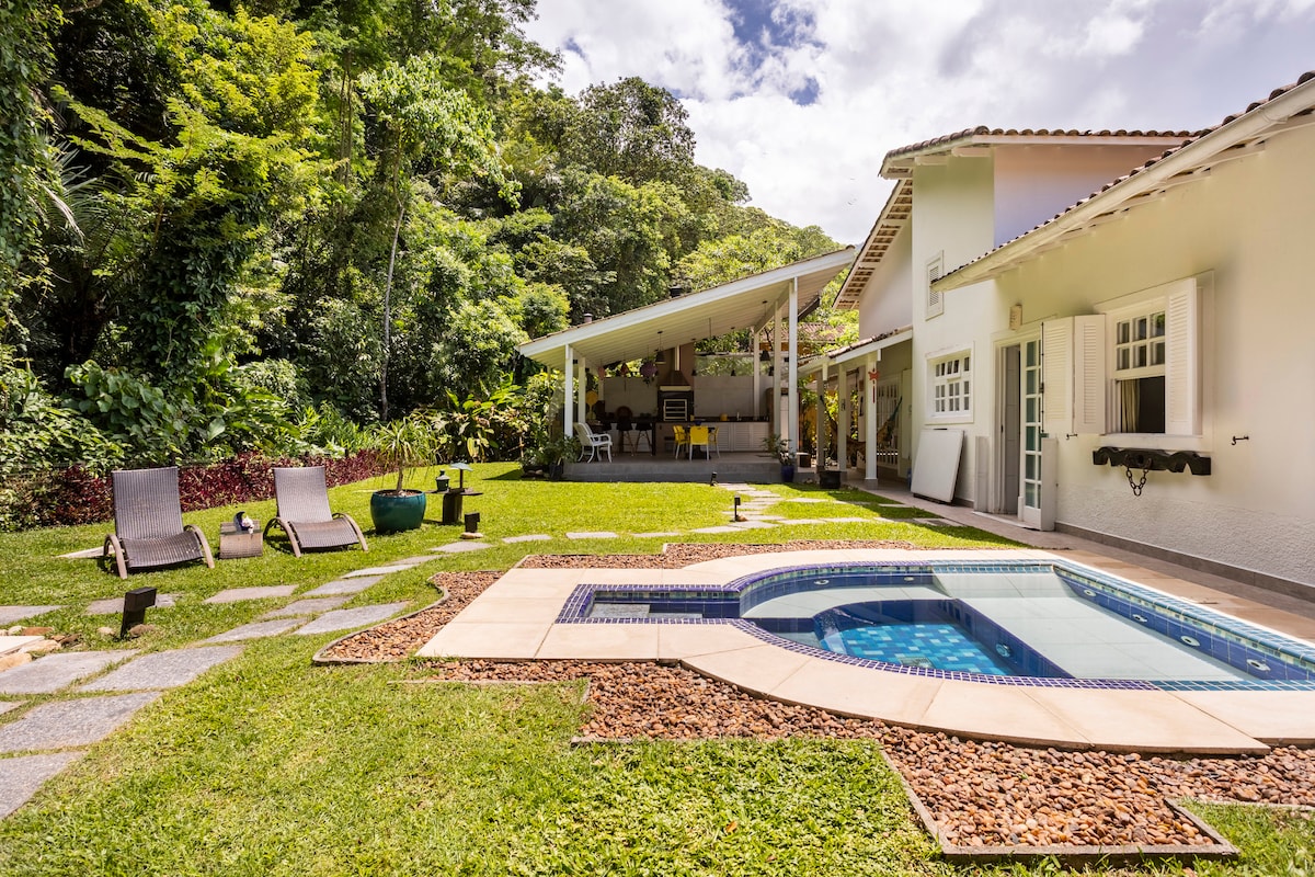 CONDOMÍNIO familiar com piscina em Paúba . Temos AR CONDICIONADO em todos os cômodos, ampla sala, lareira, cozinha americana, varanda espaçosa e 3 suítes. Temos TV/Sky/Netflix, Wi-Fi com internet em fibra 300Mbps. Área externa traseira voltada para a mata atlântica, Espaço Gourmet de 42m2 com churrasqueira, forno pizza, mesa, geladeira, além de uma jacuzzi fria (hidro desligada ) com ombrellone. A praia fica a 200m da casa e Maresias a 1 km de (5 min. de carro )Mercado e restaurante próximos.