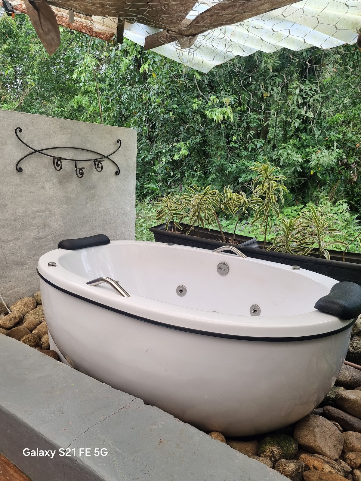 Casa com estilo e conforto , suíte 5 estrelas (chuveiro a gas e banheira grande para dois com hidro, ar condicionado, ventilador teto, colchao queen de qualidade, lençois de algodao 400 fios ,TV, WIFI rapido - dois provedores, varanda com rede, vista para mata atlantica e closet espaçoso. Para seu conforto extra - lareira, cozinha completa e kiosque-churrasqueira , piscina para dois sauna e rio tudo privativo. Jardim cercado para seu pet. Condominio tranquilo, acesso fácil as praias.