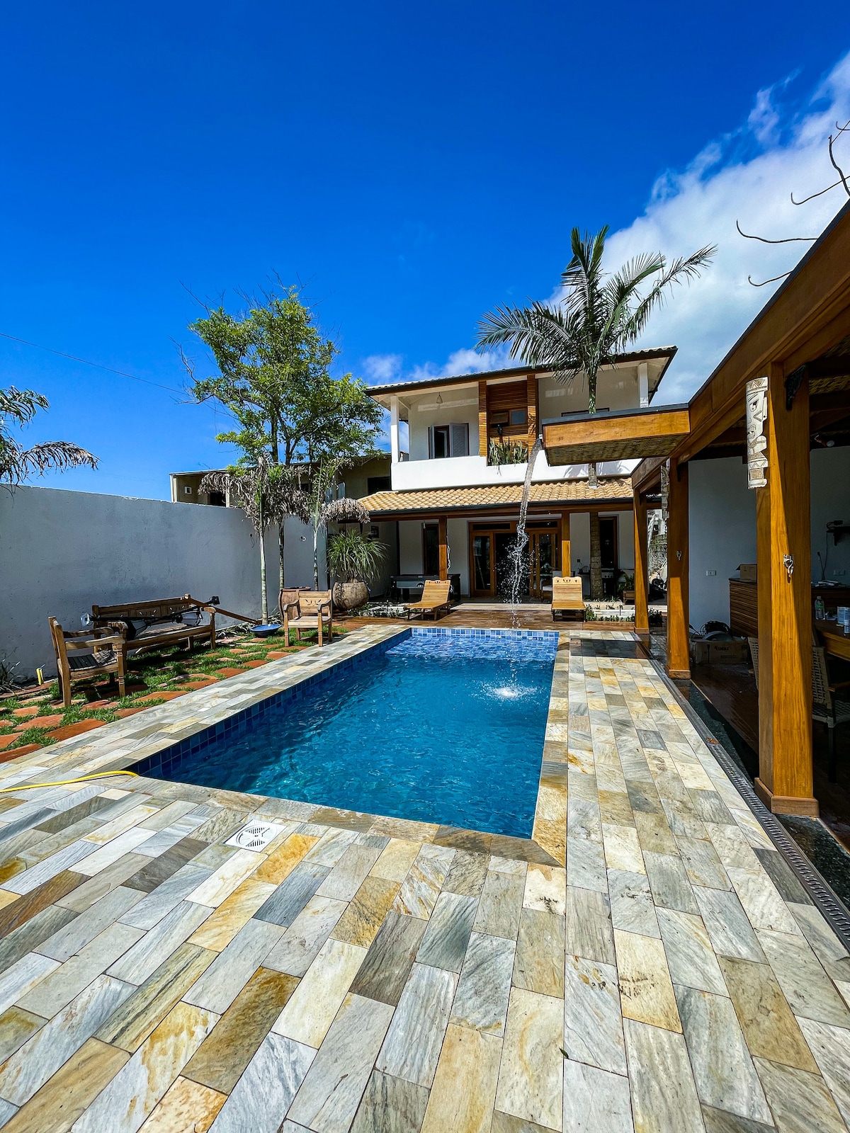Condomínio fechado, com seg. 24hs, com 4 suítes com A.C. em todas as suítes, e muito confortáveis e com roupa de cama e banho. Casa recém reformada, totalmente equipada, com privacidade total, e vista para o mar de toda a casa.Churrasqueira, piscina privativa, lavabo, Smart TV 55 ,WiFI fibra ótica pela operador, 300 mega,na sala e quartos.Fácil acesso à praia, por dentro do cond, distância de 400 metros sendo parte da volta para a casa ,subida.Alugo obrigatoriamente com o serviço dos caseiros.