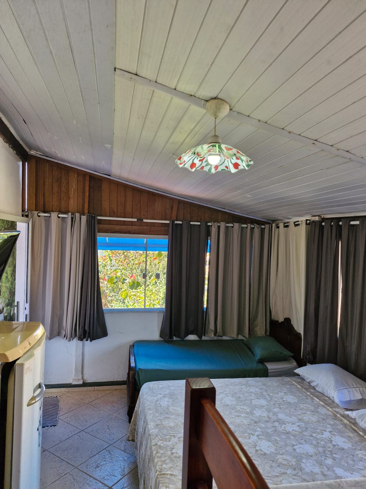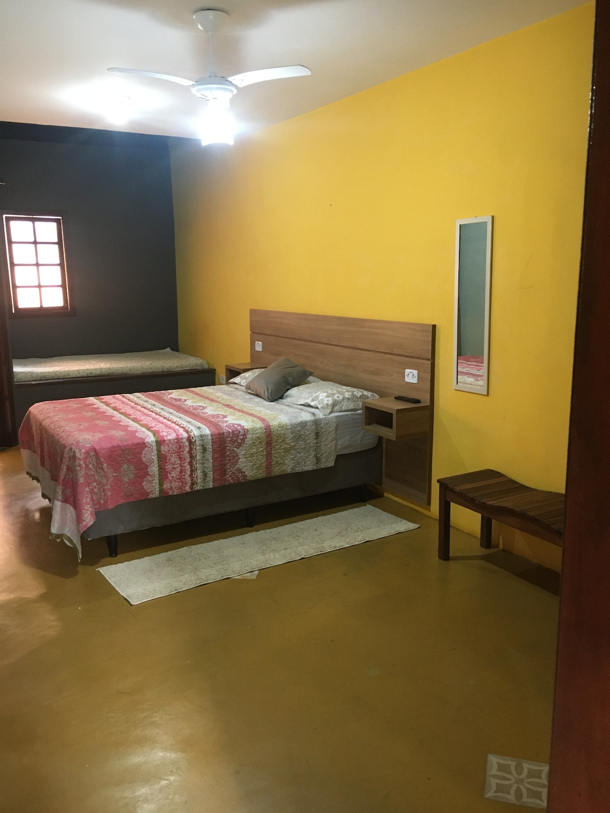 A suíte tem ar condicionado, TV e no final do 2024 um frigobar.