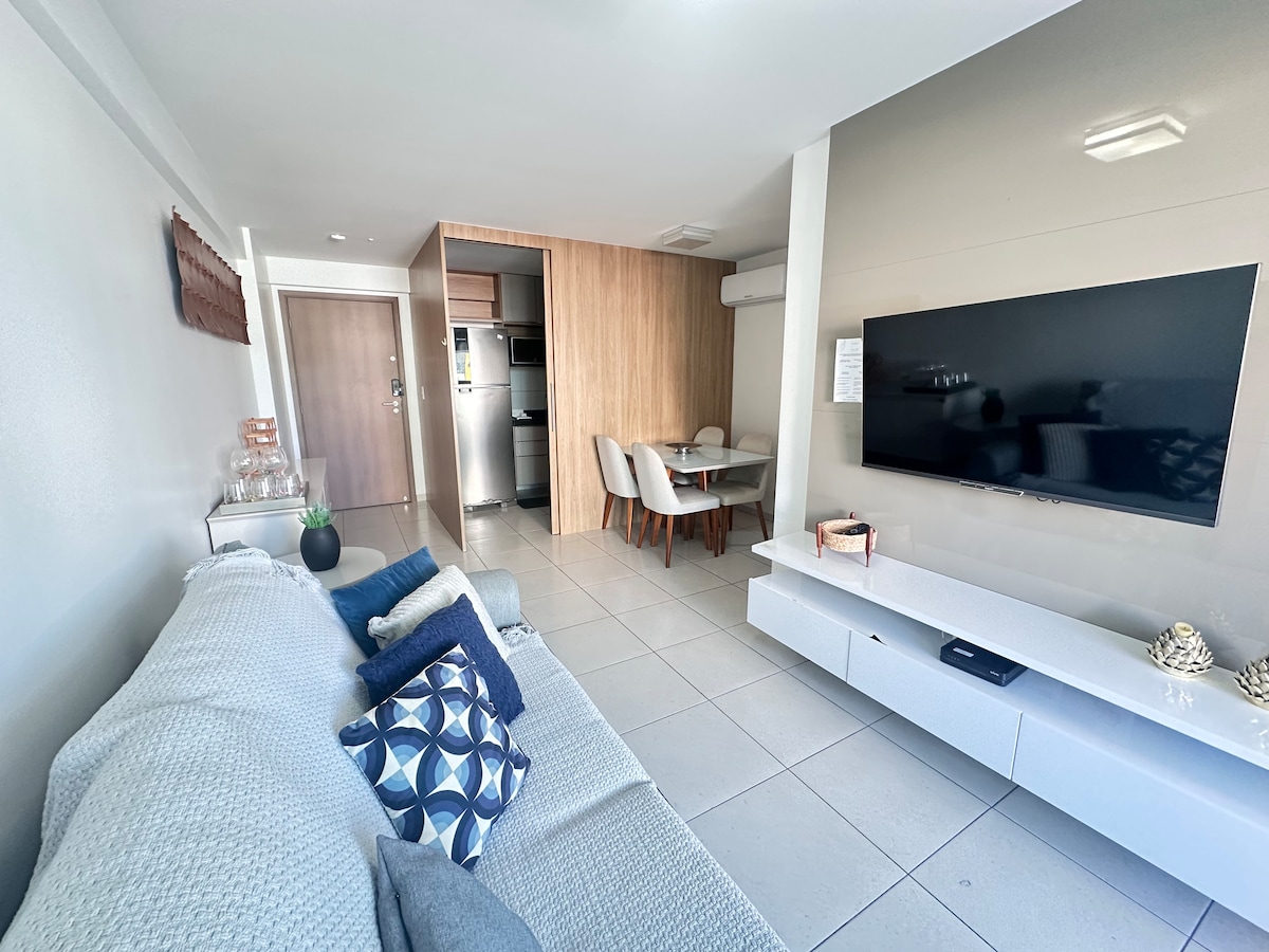 Apartamento quarto e sala completamente equipado! Cozinha com todos os utensílios, cooktop, forno, microondas, Netflix no quarto e na sala, internet 15Mb exclusiva, ar condicionado 11mb no quarto, ventilador na sala. Áreas comuns dispõe de piscina com borda infinita (na cobertura), academia, churrasqueiras. Tudo isso a 30 metros da Orla mais linda do país, considerada uma das mais lindas do MUNDO!