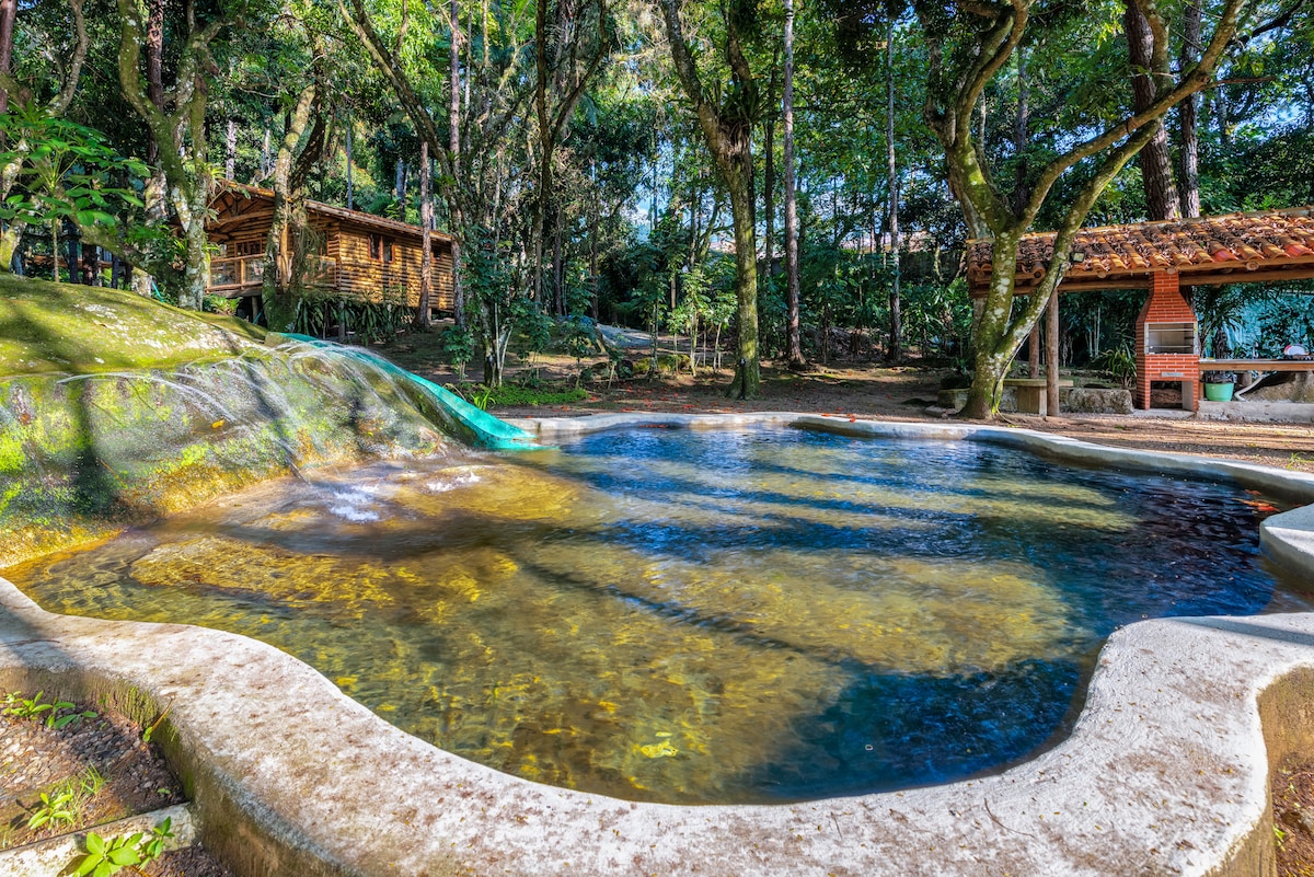 Charmoso chalé de madeira com 42 m², 2 dormitórios com ar-condicionado (quente e frio) e TV smart de 32”, Wi-Fi Fibra de 1 Gb, e 2 varandas — uma na entrada e outra no dormitório principal. A sala conta com lareira, TV smart de 50” com Netflix e YouTube, sofá retrátil e reclinável, e 2 claraboias onde você pode avistar tucanos e papagaios. A cozinha está equipada com o essencial para preparar suas próprias refeições.