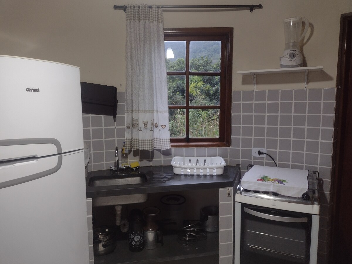 Chalé para até três pessoas, equipado com cozinha, há 500 metros da praia do Perequê e do Espaço Ardenthia. Em amplo terreno com estacionamento e quatro chalés independentes, garantindo sua privacidade. Contamos com wi-fi e vaga para carro. O chalé possui dois espaços, o principal está no térreo, com a cama de casal, cozinha e banheiro, a cama de solteiro está em um pequeno mezanino na parte superior do chalé, não há separação por portas. Aceitamos um pet de pequeno porte por chalé.
