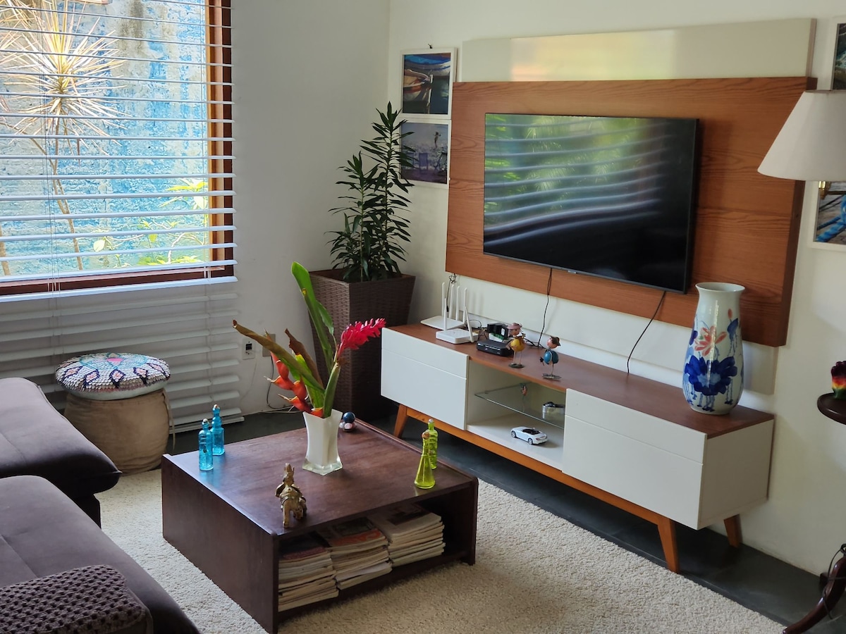 Somos uma casa de hóspedes com 3 suítes independentes. Abrace a simplicidade neste lugar tranquilo e bem-localizado. Os hóspedes terão fácil acesso a tudo o que precisarem neste lugar com excelente localização. Próximo a bares, bancos, supermercados, farmácias, shopping. Fica à cerca de 150 mtrs da praia do Perequê. Acomodação com ar condicionado, ventilador de teto, colchões confortáveis, Smart TV , Wi-Fi e quintal agradável com muito verde.