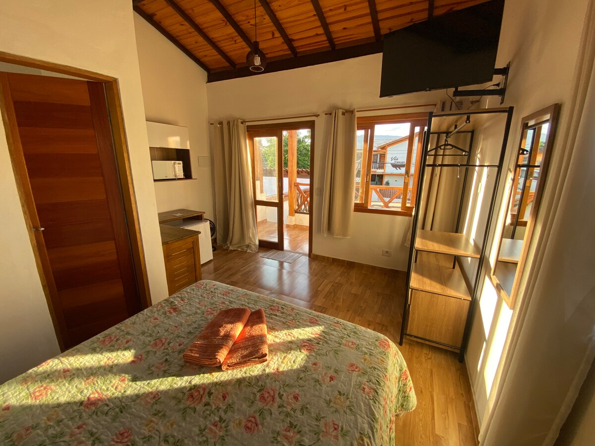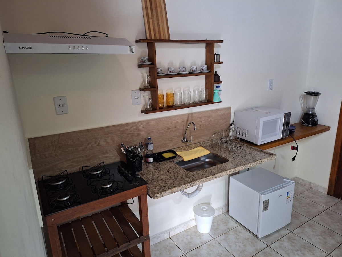 Chalé charmoso com uma suíte e uma saleta, um banheiro, ventilador de teto, tv a cabo, Wi-Fi vivo fibra 30mb, frigobar, fogão, pia e utensílios de cozinha em geral, ao lado da cachoeira, próximo ao centro comercial com mercados, farmácias e a 1km da Praia do Perequê. Não tem garagem, mas é possível estacionar ao lado da casa. Venha dormir em um local tranquilo e em meio à natureza, pertinho de tudo, rua plana e calçada, de fácil acesso. Próximo tem aluguel de bike e ponto de ônibus.