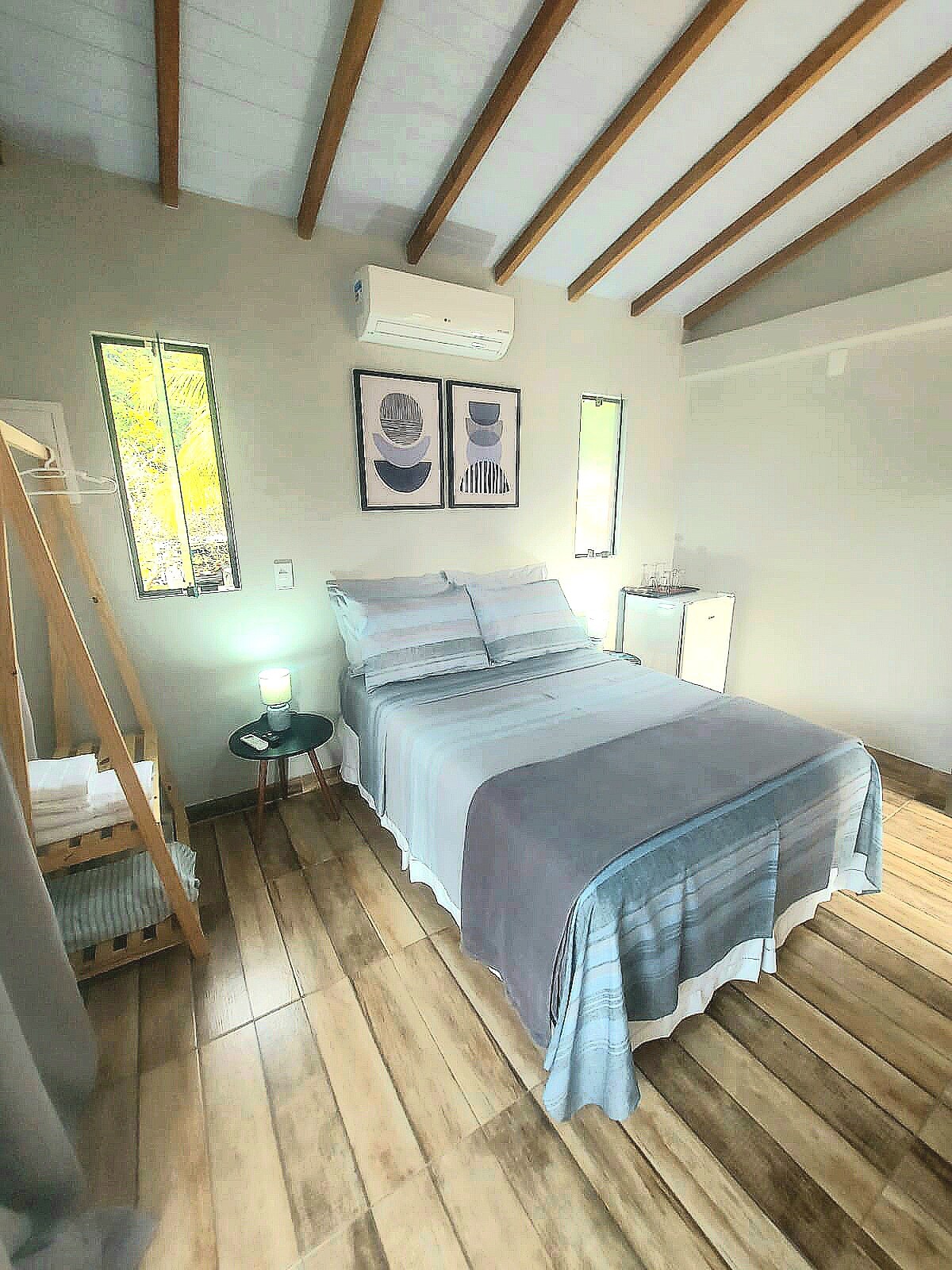 Nossa propriedade é um sítio rodeado de natureza, onde está localizado nossa moradia. Temos vista privilegiada para o mar Acomoda 2 pessoas. Temos ar condicionado, ventilador de teto, cozinha equipada com utensílios, frigobar e cooktop. Estamos a 300 m da praia da Ilha das Cabras. Não permitimos som alto, churrasqueiras Check-in a partir das 17 e check-out até as 13 hs, podendo ser ajustável, conforme a disponibilidade. Temos escadas para subir.