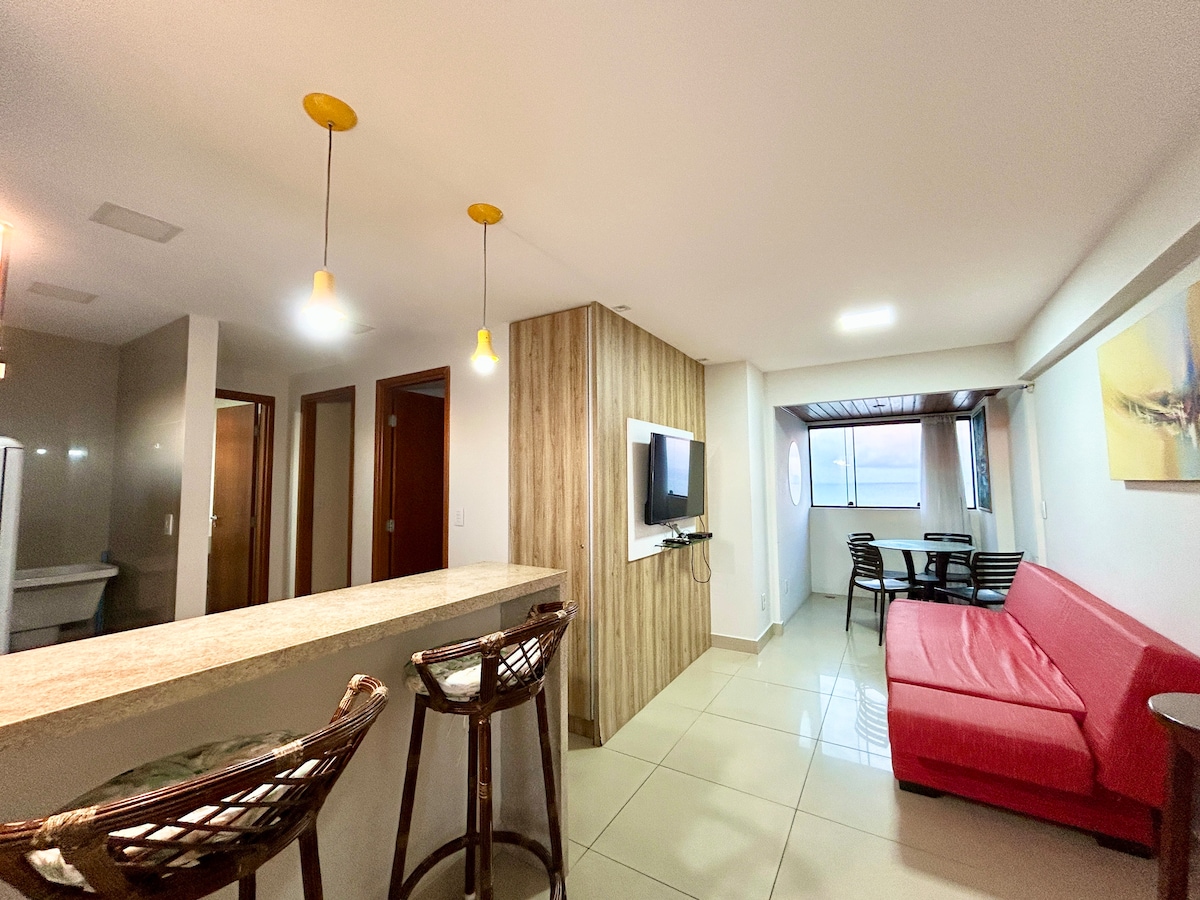 Apartamento de 50 m², com 1 quarto, sala, cozinha e varanda, de frente para o mar e para a famosa Praia de Ponta Negra. Trata-se de um flat extremamente novo, confortável e aconchegante, aparelhado por ar condicionado, Smartv de 50 polegadas com acesso à Youtube e Netflix, com TV à cabo e internet, além de contar com uma belíssima vista para o mar e morro do careca. A cozinha é equipada com louças, talheres e utensílios diversos, geladeira inox, cooktop, microondas, cafeteira e mesa de jantar.