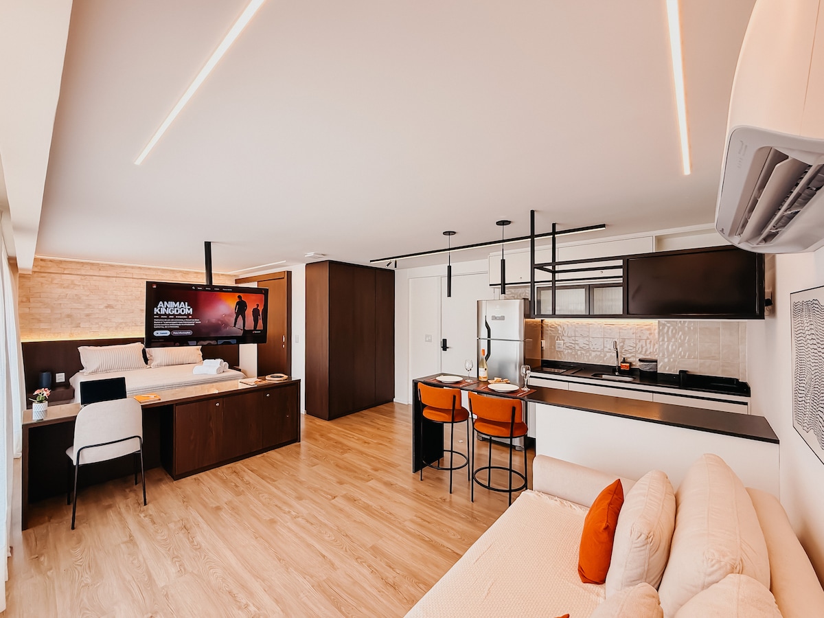 Studio novo e elegante em Ponta Negra, em prédio de alto padrão e design contemporâneo. Decoração moderna e acabamento refinado. Na melhor localização, a apenas 200 metros da praia e do restaurante Mangai, 100 metros do Camarões e a 1,5 km do Centro de Convenções. Inserido em um dos polos gastronômicos mais desejados da cidade, permite aproveitar bares e restaurantes a poucos passos. Ideal para casais, famílias, viagens a trabalho ou estadias especiais.
