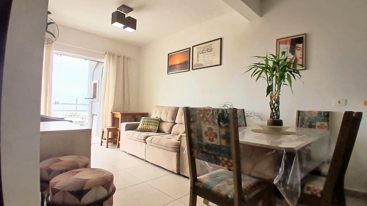 Aproveite o acesso fácil a tudo o que precisar nesta acomodação bem-localizada. Apartamento de 1 quarto com uma cama de casal e uma de solteiro. Com a possibilidade de colocar mais um colchão na sala. Prédio localizado na avenida que faz frente para o mar. Este anúncio é do apartamento térreo dos fundos. Ideal para famílias pequenas ou grupos de até quatro amigos. Cozinha completa e churrasqueira reformada (2023) com todos os itens necessários.