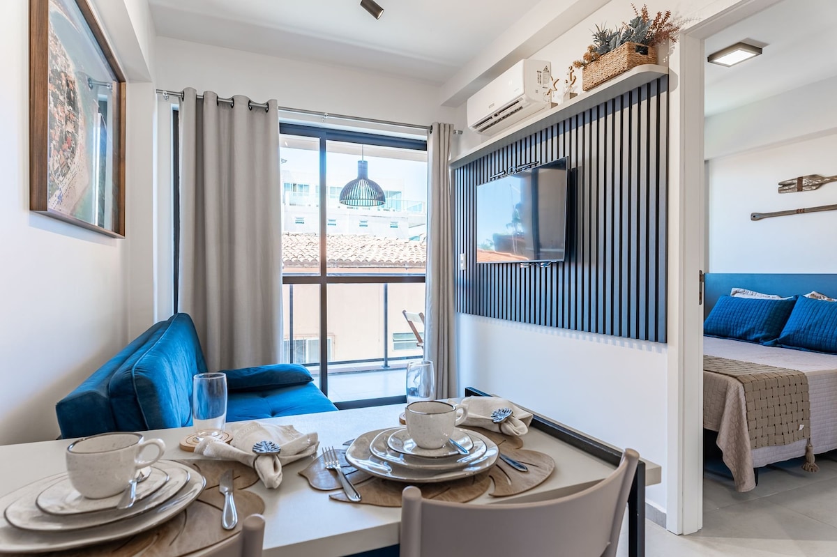 A apenas 20 passos da praia e a 9 minutos a pé do vibrante Centrinho de Porto de Galinhas, nosso Flat é o seu refúgio perfeito à Beira-mar. Desfrute da proximidade com a famosa Rua das Sombrinhas e a Feira de Artesanato, com todo o conforto e estilo que você merece. Relaxe na Rede da sua Varanda Privativa, contemplando a vista das Piscinas Naturais. O nosso espaço foi pensado para o seu Máximo Conforto. Sala de estar convida ao descanso no Sofá cama e uma Smart TV 55", equipada ao Prime Vídeo.