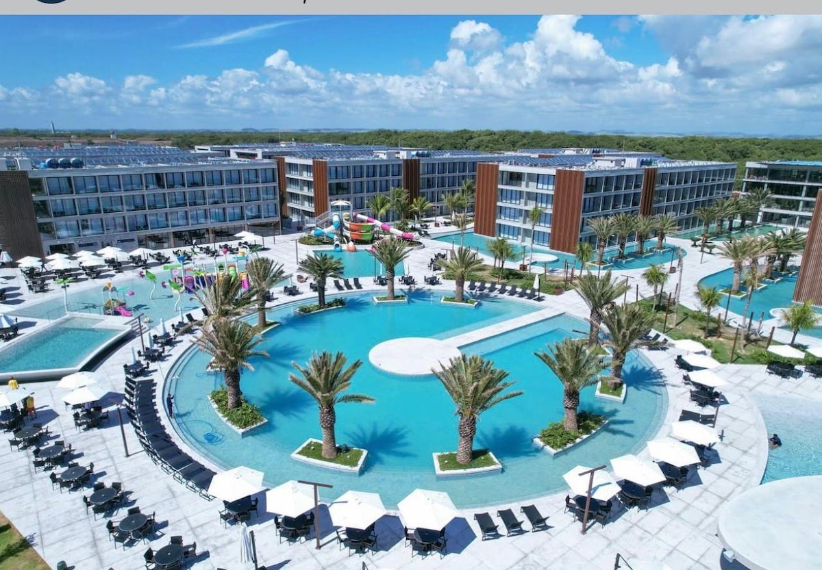 Curta uma experiência luxuosa ao ficar neste lugar especial.quarto com cama de casal e sala com sofá cama pra 2 pessoas,tv e ar condicionado em todos os cômodos,Resort novo e de altíssima qualidade,são várias piscinas para desfrute de sua família,pé na areia com piscinas naturais e passeios incríveis