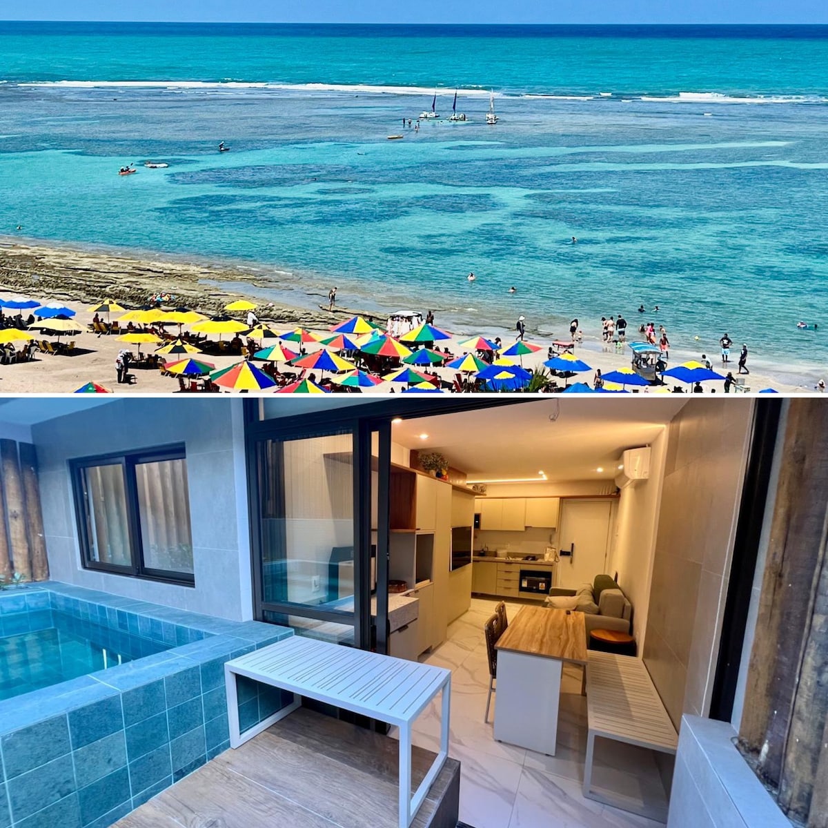 Bem-vindo ao nosso apartamento recém-inaugurado em Porto de Galinhas, a praia mais popular do Nordeste do Brasil. O apartamento é ideal para hóspedes que desejam um apartamento studio com uma cozinha compacta equipada, uma cama de casal e uma bicama confortável, tudo isso na beira da praia das piscinas naturais, uma das principais atrações da cidade e 100m da rua principal de Porto. Aproveite também do nosso rooftop com churrasqueira e uma piscina com borda infinita de frente para o mar.