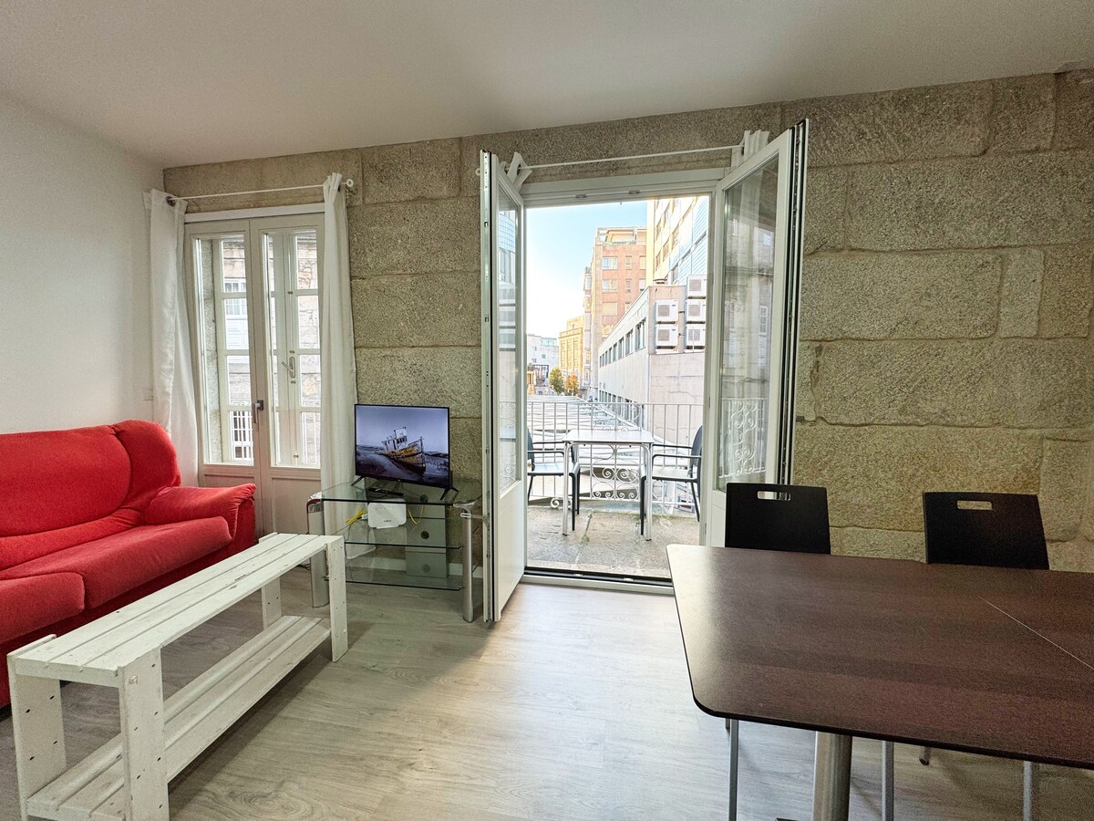 Una experiencia de lujo en este céntrico y luminoso apartamento equipado como una suite de hotel. Edificio histórico. El dormitorio, presidido por una confortable cama King size, Smart TV, balcón y un baño completo. El salón cuenta con una coqueta cocina americana, un comedor, Smart TV de gran formato, una cómoda mesa de trabajo junto al ventanal y un sofá- cama. Dos ventanales de tres metros de altura con balcones que se asoman a la “Puerta del Sol de Vigo”. Próximo al puerto- Islas-Cíes