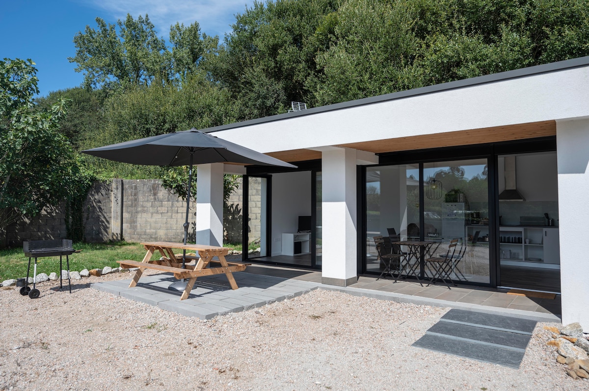 ¡Bienvenido a nuestra casa en la playa de Doniños! Construida con materiales naturales y modernos, ofrece 3 habitaciones, 2 baños y vistas impresionantes a la laguna y playa. Esta casa de máximo 8 huéspedes esta ubicada en una finca de más de 1700 metros cuadrados, rodeada de exuberante vegetación, donde reina una tranquilidad absoluta. Podrás disfrutar de un entorno idílico y un ambiente que invita a sentirse en paz, perfecto para familias que buscan escapar y conectar con la naturaleza.