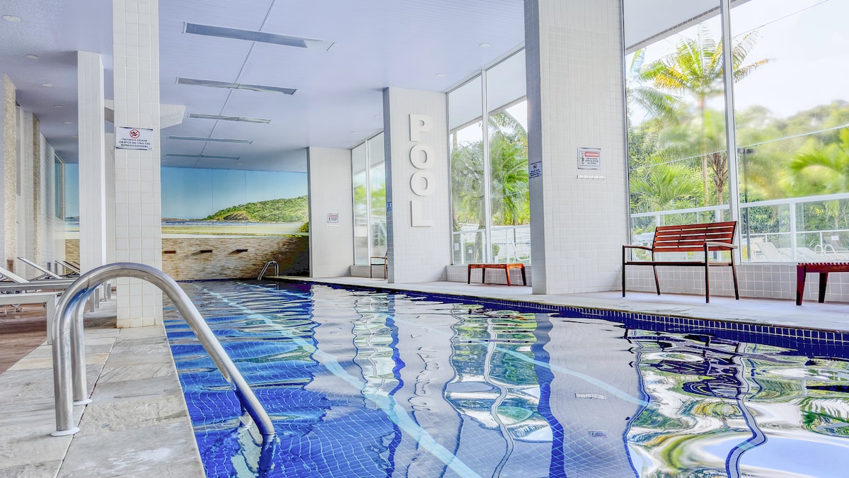 Beautiful apartment with a pool view. Well equipped, cozy, and in a prime location: between São Lourenço, Riviera, and Itaguaré beaches. It offers beach service, air conditioning in the living room and both bedrooms, two TVs, high-speed internet plus a full Claro TV channel package, dishwasher, washer-dryer, Electrolux water dispenser, complete kitchen utensils, towels, and bed linen. Everything is of high quality to ensure a comfortable and enjoyable stay for you and your family.