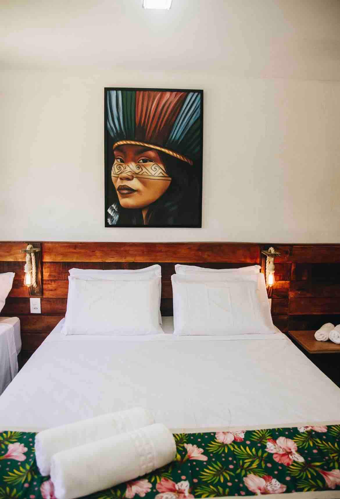 O quarto possui uma cama queen, frigobar, smart TV e ar-condicionado split, oferecendo privacidade e máximo conforto para duas pessoas.