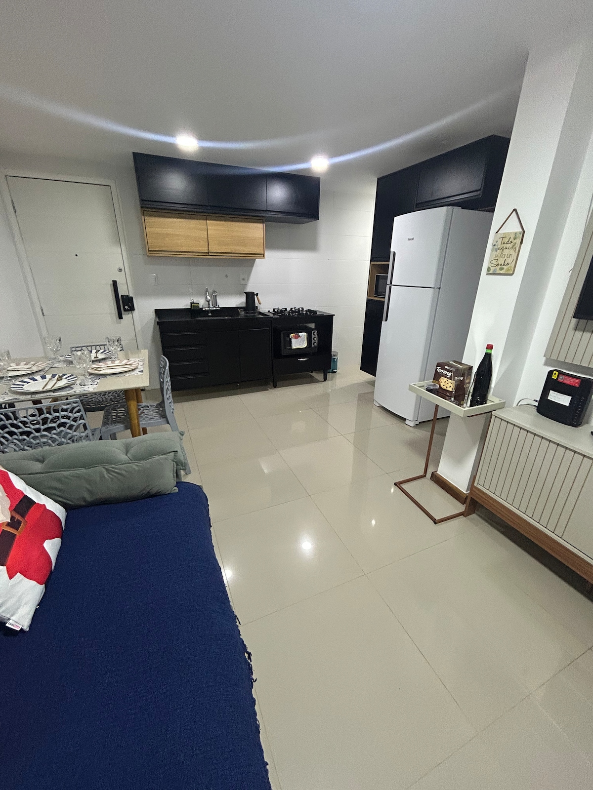 MY ESPACE is good for couples, families and well behaved young people. Maximum is six guest. There's no playground or ballroom for parties. Garage for 2 cars. It is 400m walking distance from the Recreio beach, easy access to buses, BRT and then to the Subway. It's all new. It has easy access to wheelchair (through Elevator), WiFi 600 MB, cable TV. Table for executive work, Nobreak (see photos), voltage 110. CHILDCARE - no protective net for balcony/windows. The balcony has glass curtain.