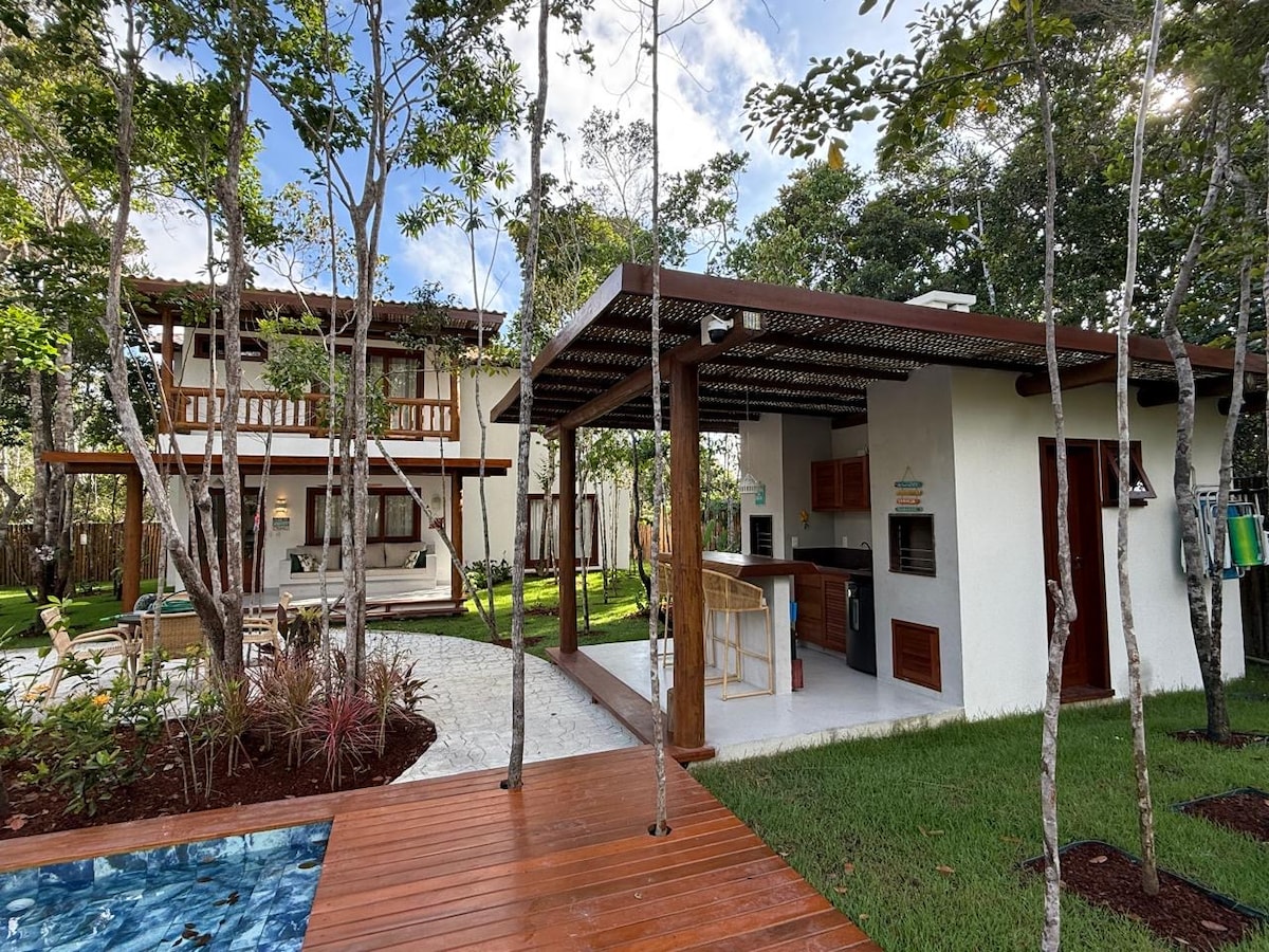 Casa 5 is located 25 mt from the sea, with direct access to the beach and 15 mt from the pool. Recently renovated and tastefully furnished in Italian style. Fully equipped with all the necessities. It consists of a living room, an open kitchen with a large pantry, three suites, and a wonderful balcony with churrasqueira. Free Wi-Fi, free parking, and 24-hour security are available. Direct access to the famous Rua do Mucugè, which can be reached in 2 minutes on foot, without needing to use a car