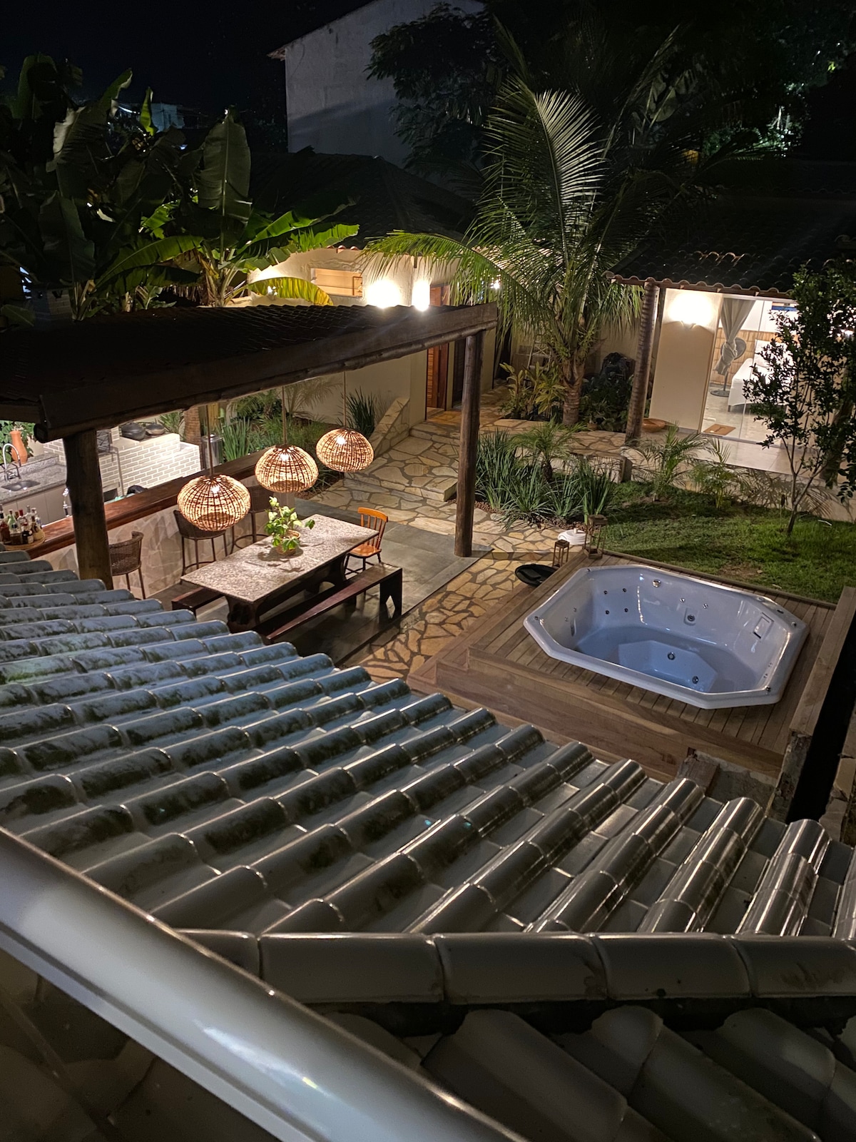 Casa com influência das vilas balinesas, rústica mas extremamente aconchegante e refinada, com tudo do mais alto padrão, móveis, eletrodomésticos, roupas de cama e banho. Área gourmet dos sonhos com churrasqueiras a gás e a carvão, forno a lenha, cooktop e defumadora. Spa com 1,4k litros aquecido, sauna toda em pedra hijau com vista panorâmica da floresta. 5 enormes telas, 2 delas de 75". Equipamentos Elettromec, Kitchen Aid, Le Creuset. Internet 500 Mb. Paraíso para os amantes da gastronomia!