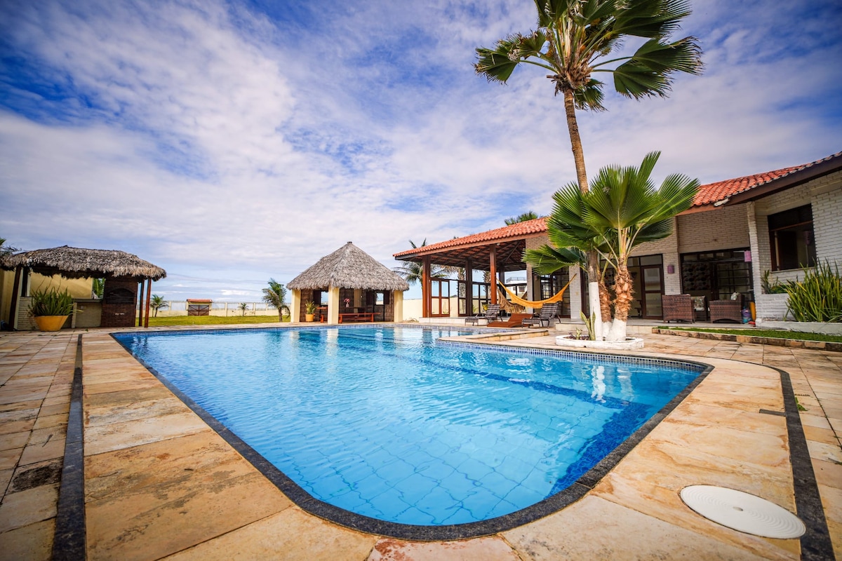 A choice of rooms or the whole house, we are beachfront on Praia de Taiba . 5 bedrooms 4 bathrooms. Expansive gardens and beach garden , all private. 1st floor balcony with sea views, large private pool and terrace with bbq/bar poolside. Perfect for kite , surf and beach leisure. We organise full breakfast and daily cleaning for you at your pleasure. Only a few minutes from Taiba town and all amenities close by.