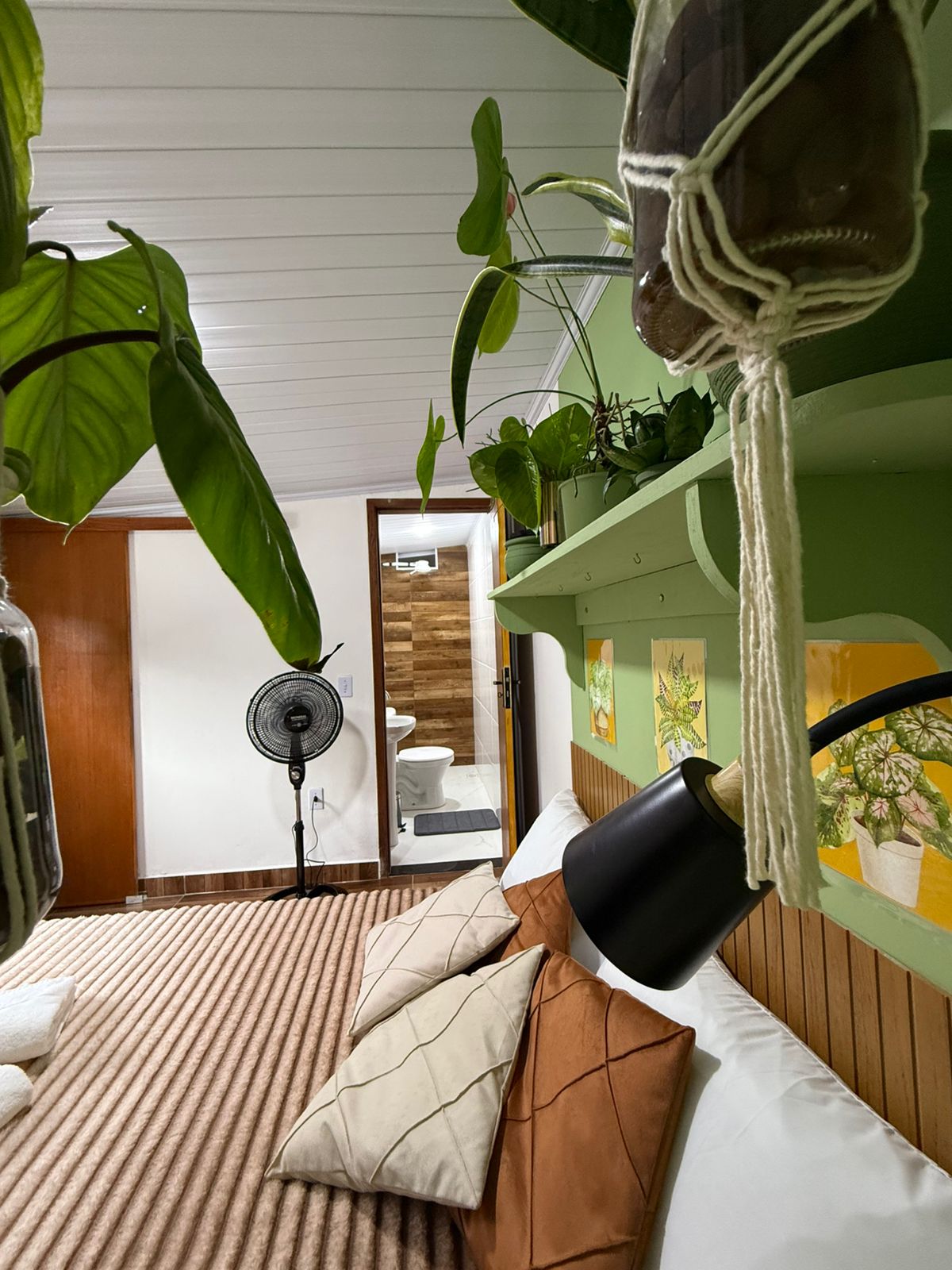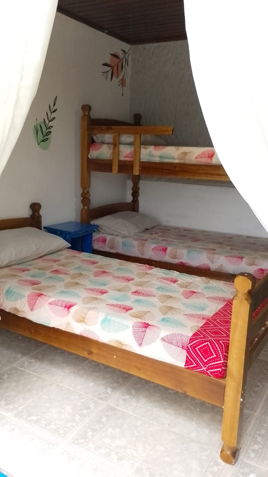 Esqueça de suas preocupações neste lugar espaçoso e tranquilo. Quarto com ventilador /cozinha compartilhada. Quarto para 4 pessoas. Composto com duas cama beliche com cortina privativa. Roupas de cama/toalha de banho e manta para os dias mais frio/Sabonete/Shampoo condicionar. Banheiro externo no primeiro piso Uma boa opção de hospedagem Econômica e confortável... Área para relaxar e interagir com outros hospedes. Durma com o som da cachoeira e acorde com o canto dos pássaros.