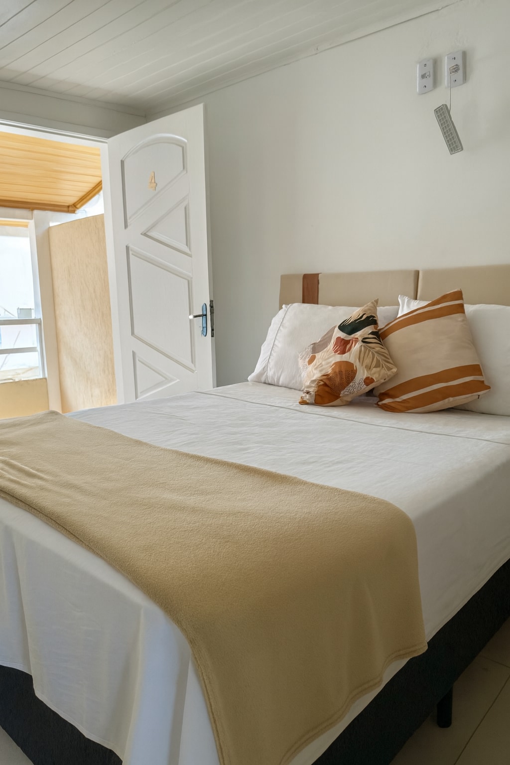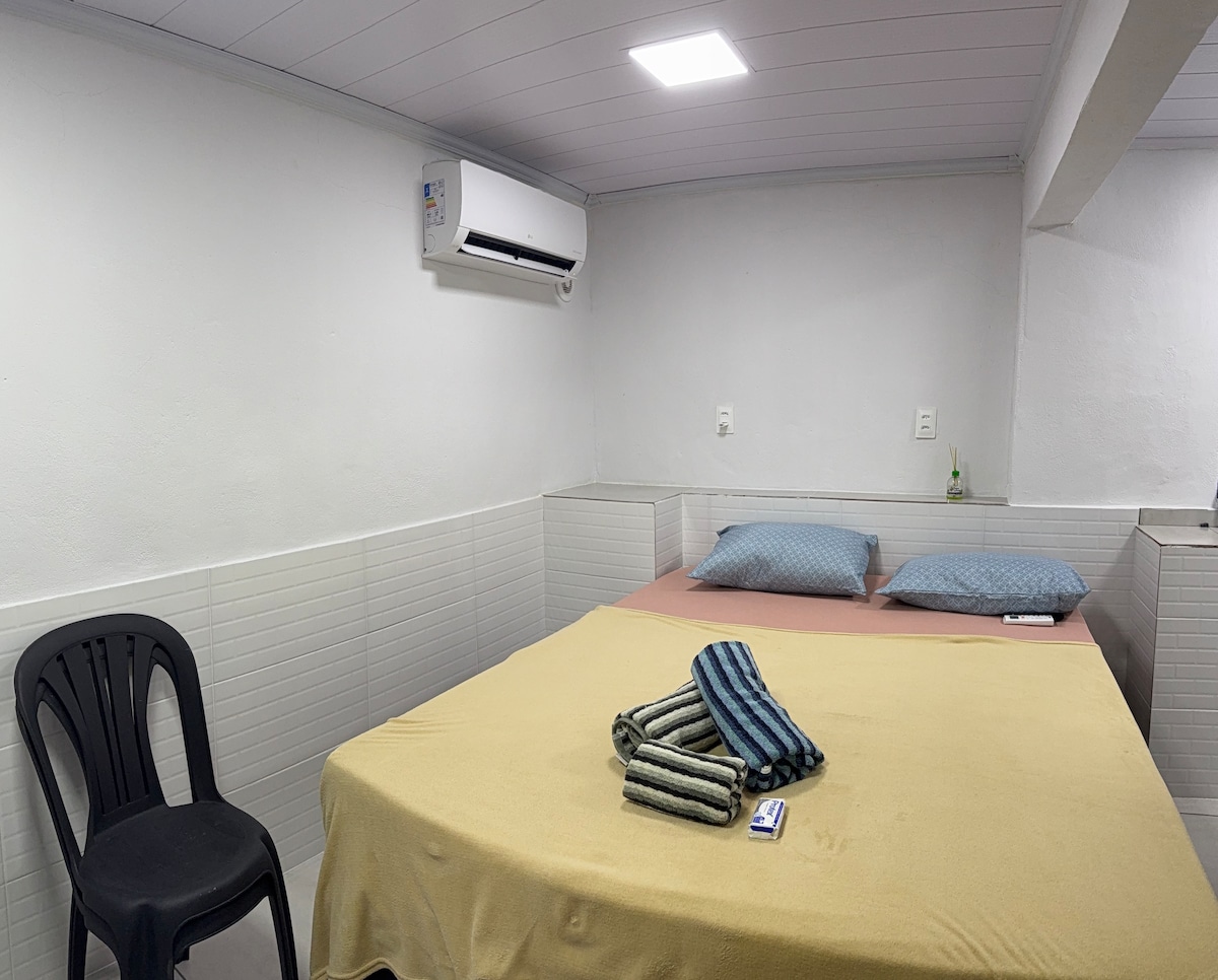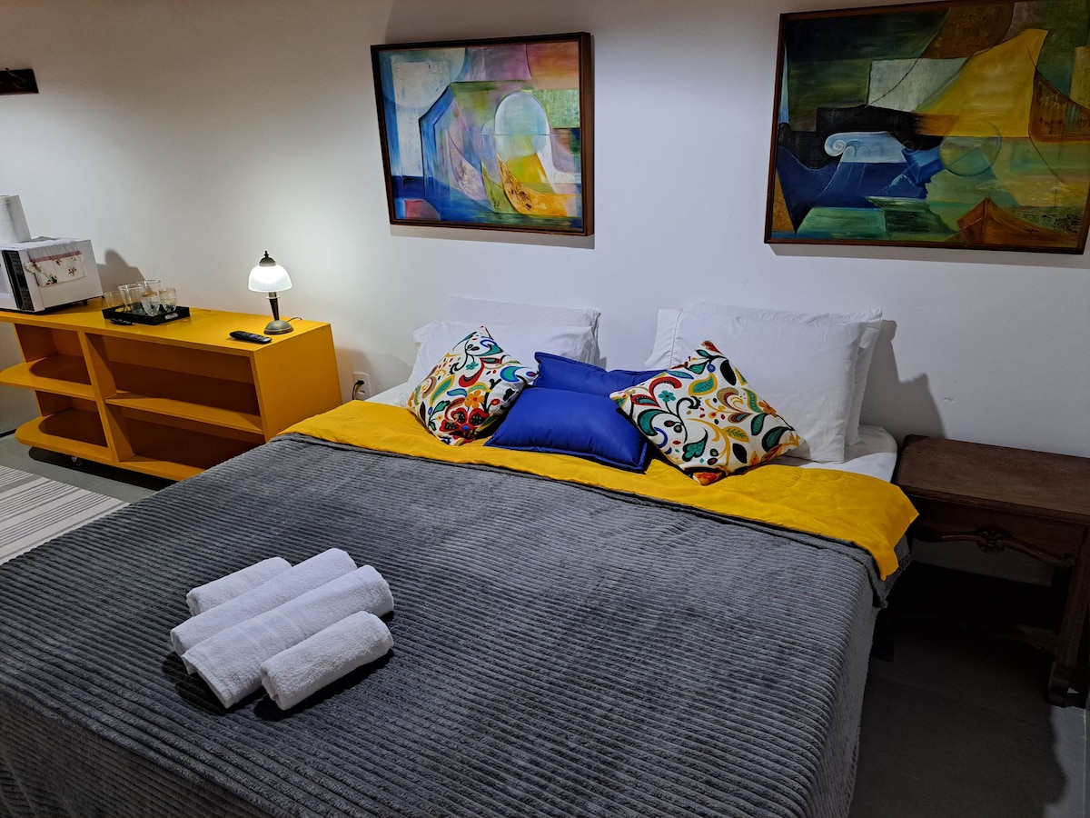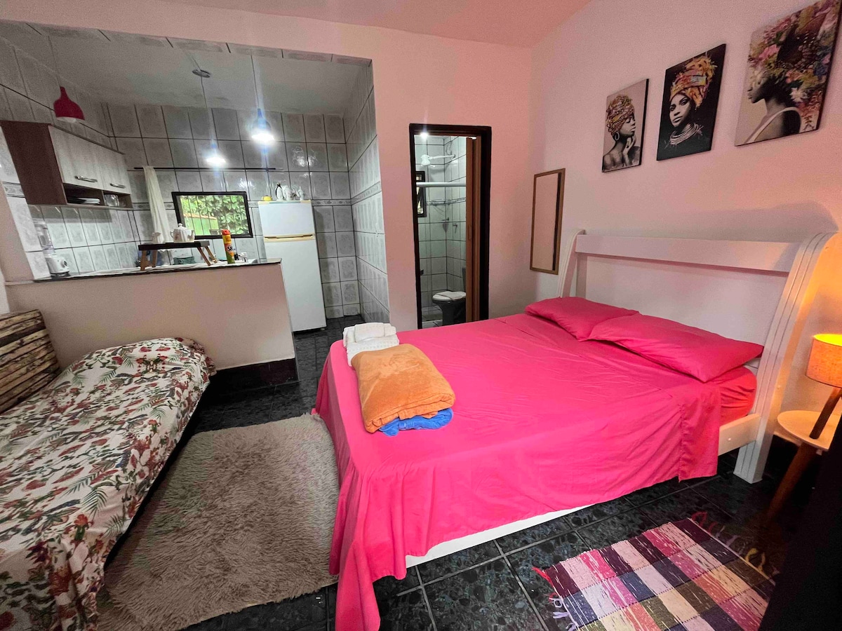 Suíte (quarto e banheiro), com cama casal queen, ar condicionado, tv 40 (globoplay, Netflix e primevídeo), frigobar, micro-ondas, cafeteira, sanduícheira, ventilador, secador cabelo, ferro, luminária leitura , luz emergência. Prato, xícara, copo , talheres, abridor vinho, pano de prato e roupa cama e banho. Para 2 pessoas. Área externa na entrada com ducha, torneira para lavar os pés, mesa e cadeiras. Banheiro com chuveiro elétrico. Indicação de deliverys.