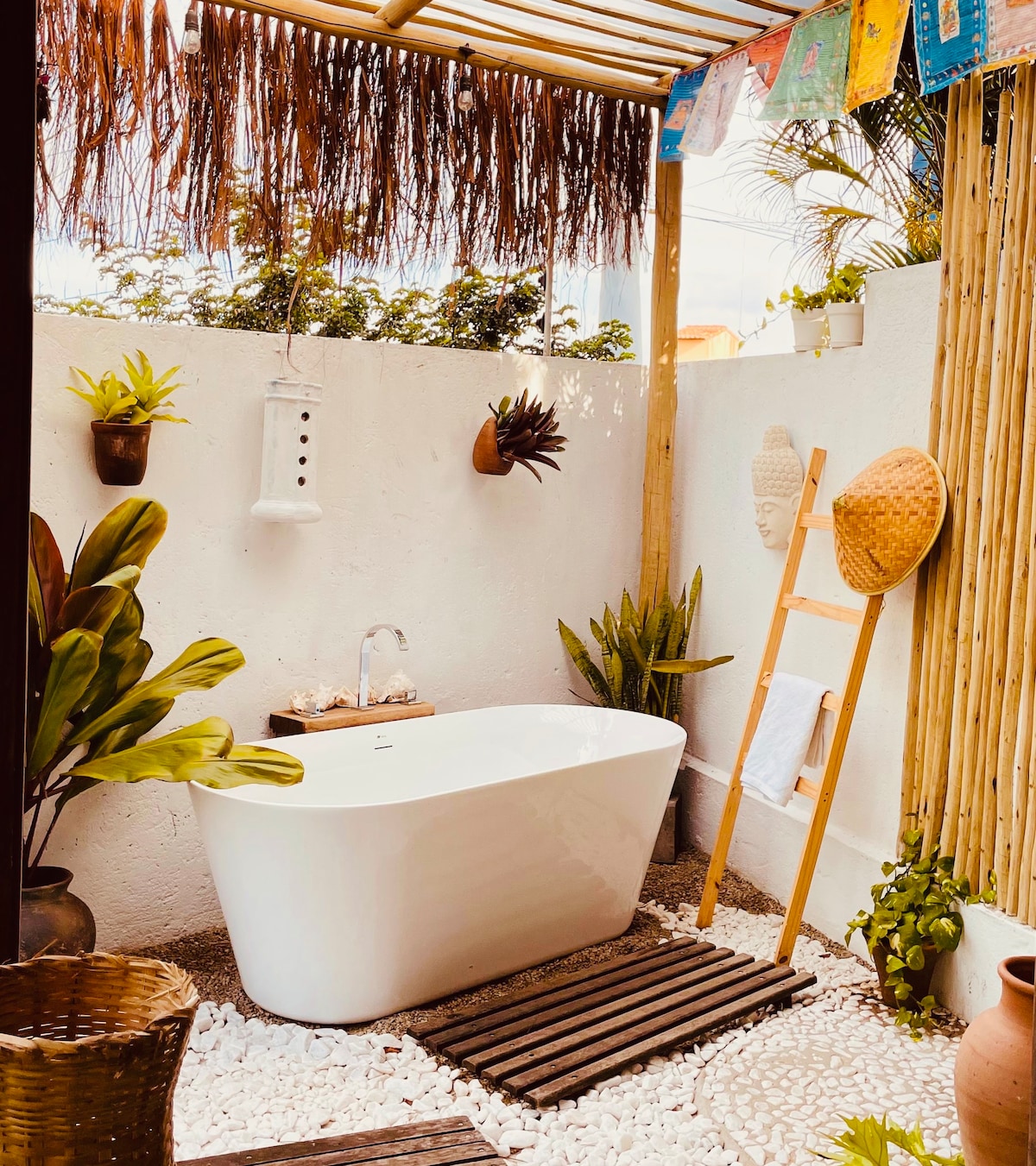 A Casa Céu reúne elegância, conforto e leveza em ambientes amplos, iluminados e naturalmente ventilados. A suíte oferece cama queen-size, ar-condicionado, closet, banheiro com chuveiro quente e um espaço exclusivo para trabalho. A cozinha espaçosa integra-se harmoniosamente a casa e a sala de jantar à noite ganha um clima romântico. O grande destaque é a área externa, com uma banheira rodeada por um lindo jardim perfeita para relaxar e se conectar profundamente com a natureza.