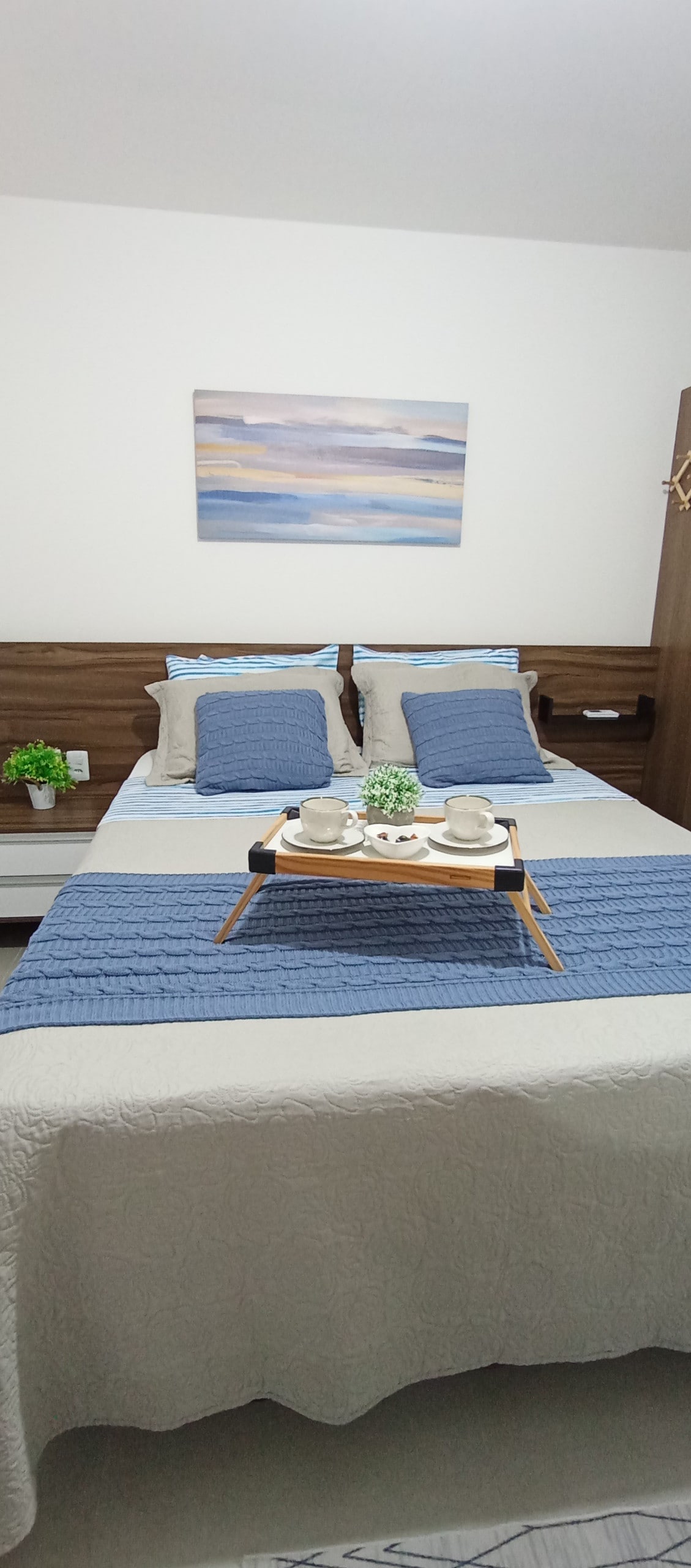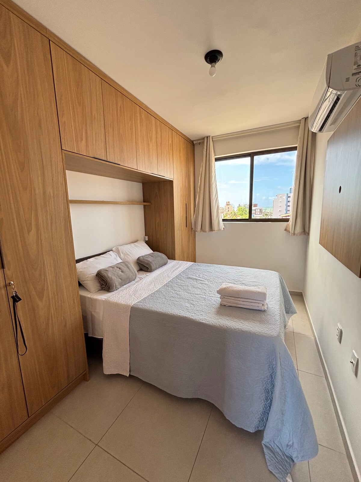 Our Apto Luxo Frente Mar #1 with parking space and capacity to accommodate up to 5 people. It features 2 queen beds, a sofa bed in the living room, air conditioning, and a Smart TV in each room. The kitchen is compact and includes a cooktop, microwave, coffee maker, sandwich maker, and utensils for quick meals. The building offers a rooftop pool, gym, laundry room. Oceanfront condominium, located near restaurants, bakeries, gas stations, and mini markets. Comfort and convenience for your stay!