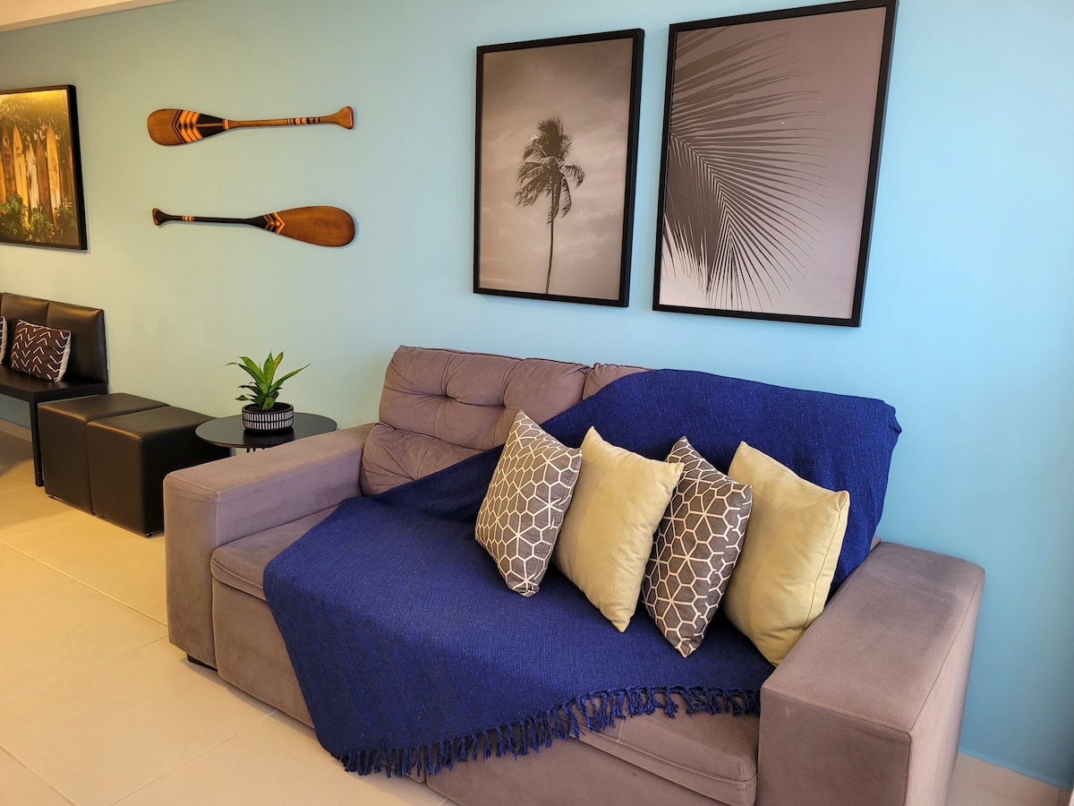 Oceanfront Apartment with parking space and capacity to accommodate up to 5 people. It features 2 queen beds, a sofa bed in the living room, air conditioning, and a Smart TV in each room. The kitchen is compact and includes a cooktop, microwave, coffee maker, sandwich maker, and utensils for quick meals. The building offers a rooftop pool, gym, laundry room. Oceanfront condominium, located near restaurants, bakeries, gas stations, and mini markets. Comfort and convenience for your stay!