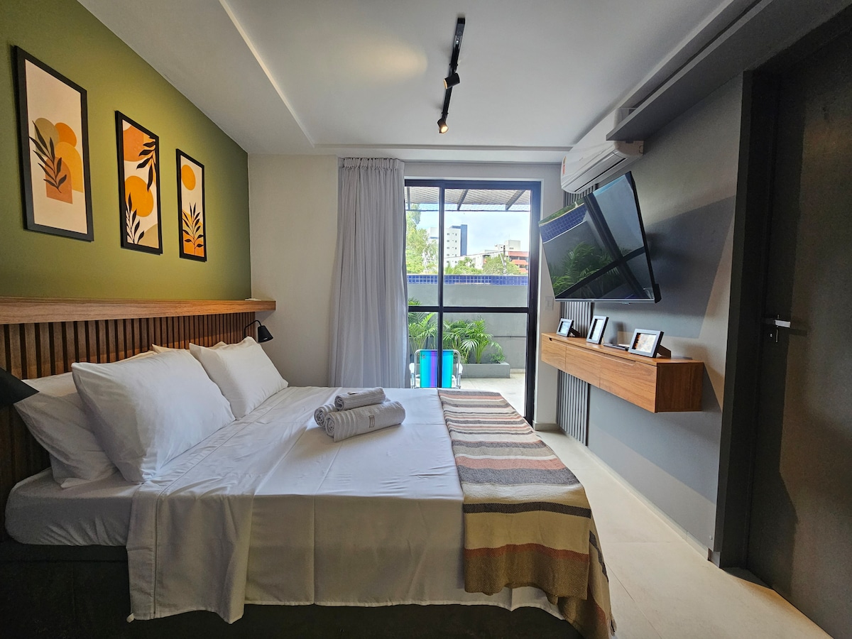 Apenas 2 minutos de caminhada da beira mar! * Wi-Fi de 700 Mb - Ar condicionado * Smart TV de 55” - Cozinha completa * Self check-in - Portaria 24 horas * secador de cabelo - Mesa para Home Office *Lençóis e toalhas estão inclusos. * Caixa térmica de apoio para praia e piscina * 1 cama de casal e 2 de solteiro. * Ferro de passar roupa Distancias: 50 m da Praia do Bessa 1,5 km Mag. Shopping 2,0 km Shopping Manaíra 2,5 km Letreiro de João pessoa (Tambaú) 3,0 km Cabedelo.