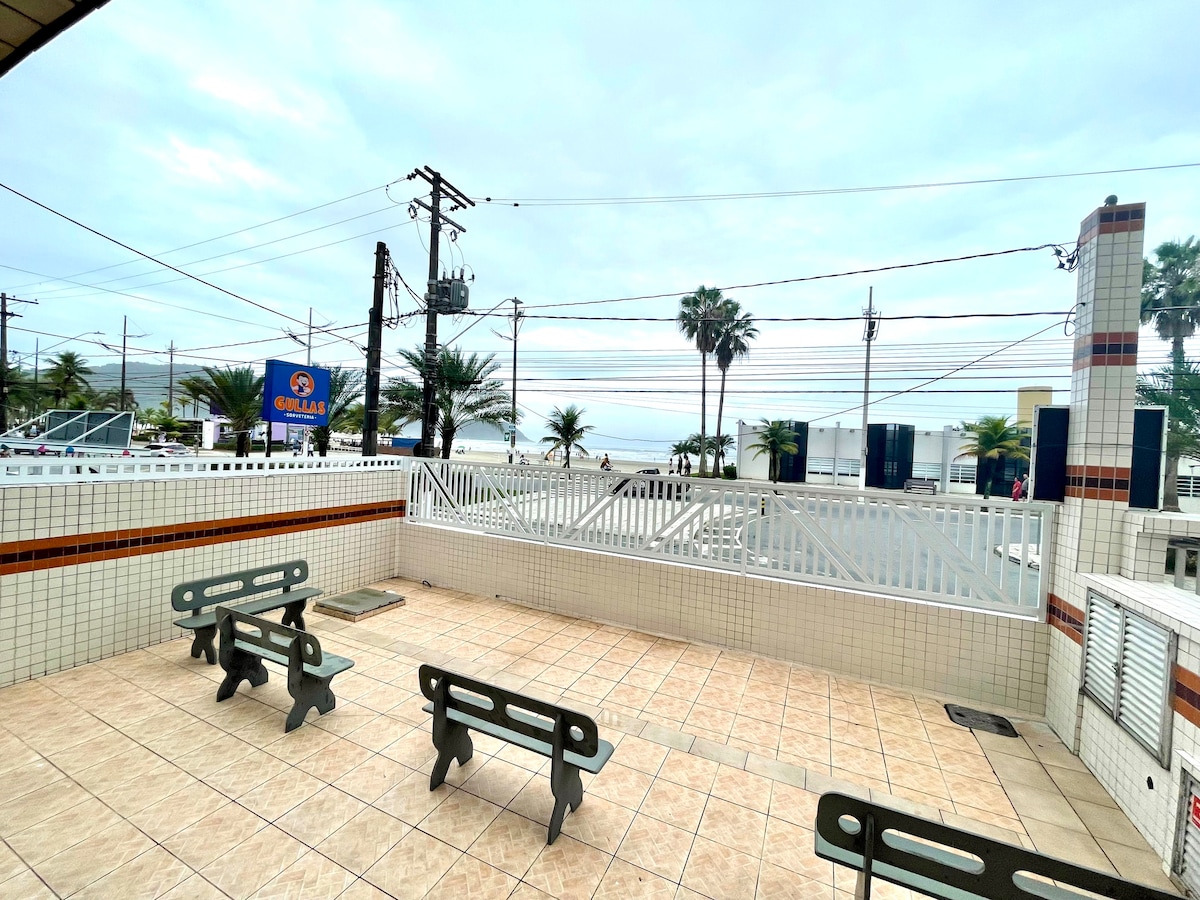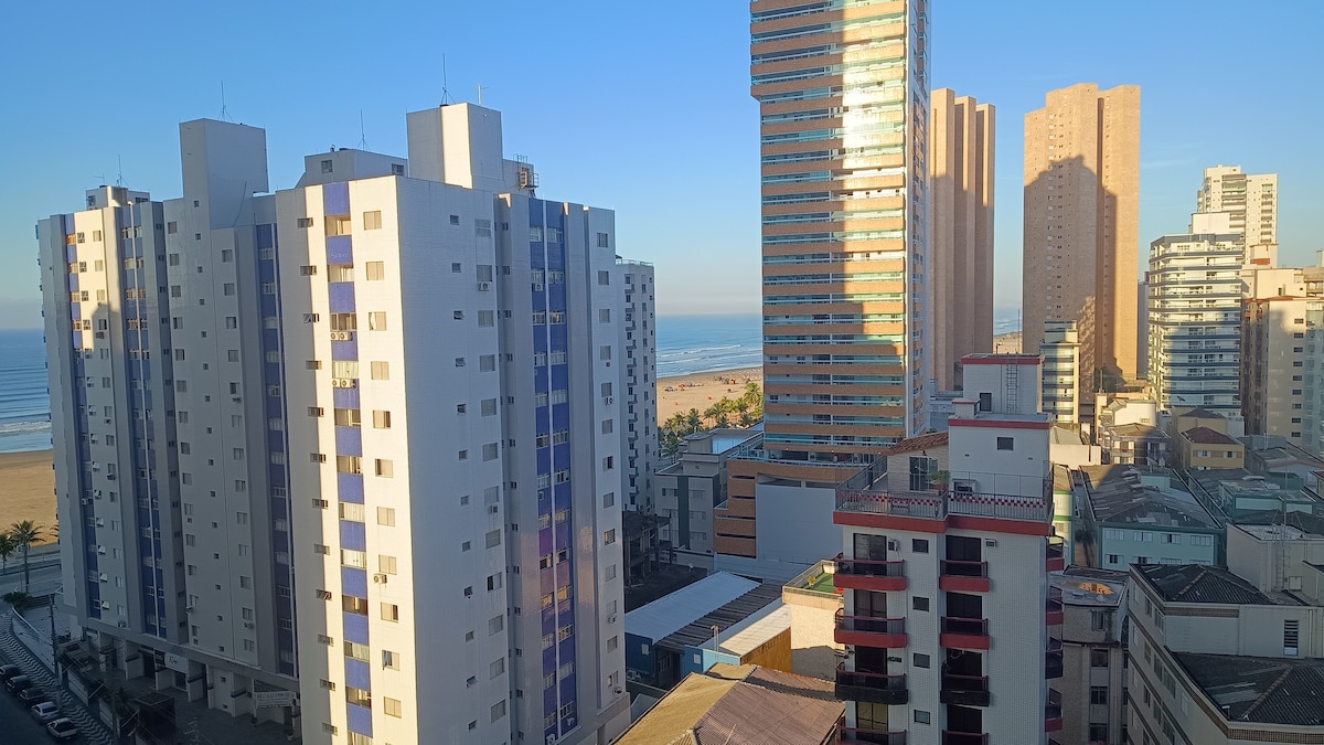 Acorde com o som das ondas e a vista incrível para o mar da Praia da Guilhermina. Apartamento pé na areia, espaçoso e completo, ideal para famílias e grupos de até 6 pessoas. Localização privilegiada em frente à feirinha e próximo a tudo!