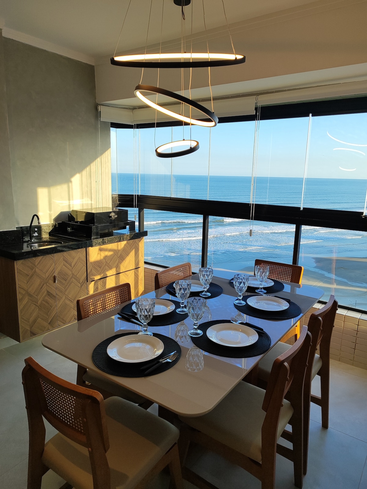 Vista frente mar total maravilhosa em um lindo apartamento decorado frente mar total 2 dorms, (1 suíte). Ar condicionado. O mais belo e encantador nascer no sol, juntamente com o delicioso barulho do mar! Você irá sentir uma paz e ficará encantado com essa experiência! Além disso tenha o privilégio de presenciar o pôr do sol frente mar numa sala de estar e jantar linda com ar condicionado, móveis de altíssima qualidade, tvs smart, cafeteira Nespresso, cozinha completa com fogão indução.
