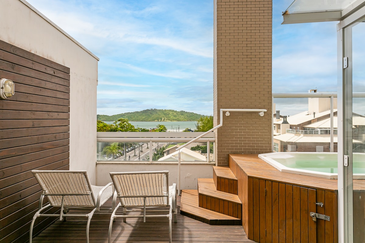 Luxury penthouse with total privacy, ocean view, jacuzzi, barbecue and large outdoor terrace in front of Campeche beach, one of the most beautiful beaches in Florianópolis! Spending your vacation at the Thai Beach Home Spa condo is like being at a 5 star resort! With a heated indoor pool, outdoor infinity pool, indoor and outdoor jacuzzis, gym, playground, an incredible common area! Central location near restaurants, bakeries, supermarkets and shops.