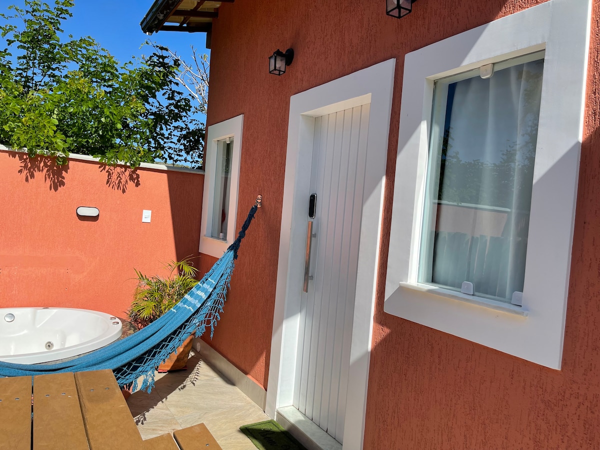 The guesthouse is close to Rua das Pedras and from Ferradura beach (around 500 mts from both places). Herein is a quiet place, good to rest and relax. Ideal for couples, the house has a balcony, a deck in the living room and bedroom, living room, kitchen for small meals, covered barbecue area, SmarTv, wi-fi internet, bathroom, outdoor shower, indoor parking and a large grassy area.
