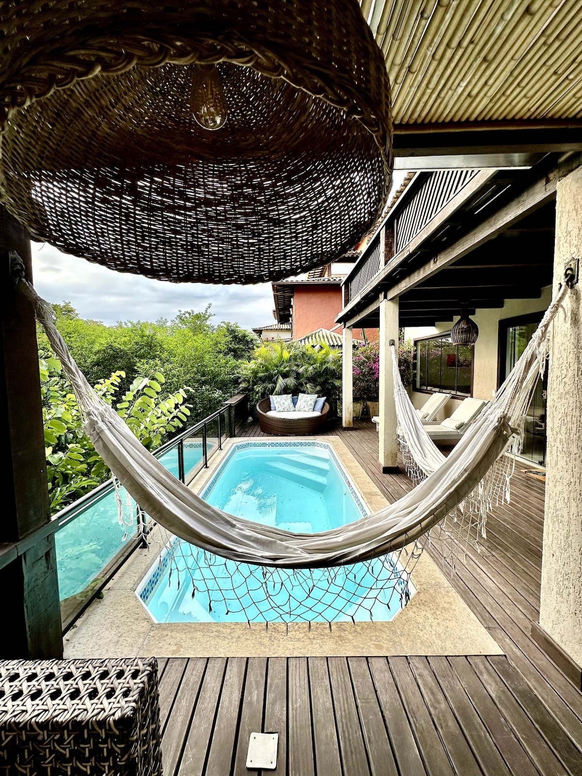 Casa tipo loft com cozinha jardim interno 2 suites 1 no primeiro andar com varanda e a 2 no terreo intrgada no loft com divisorias em tecido. sala ampla com mesa para 12 pessoas , 3 sofas espaçosos. Varanda coberta no jardim interno com mesa de jantar, churrasqueira portatil e ducha. Cozinha toda equipada com utensilios para 6 pessoas. Area de serviço com tanque e varal de roupa. um espaço escritorio com otima conecçao internet. Tudo decorado no estilo Balines. A piscina é compartilhada.