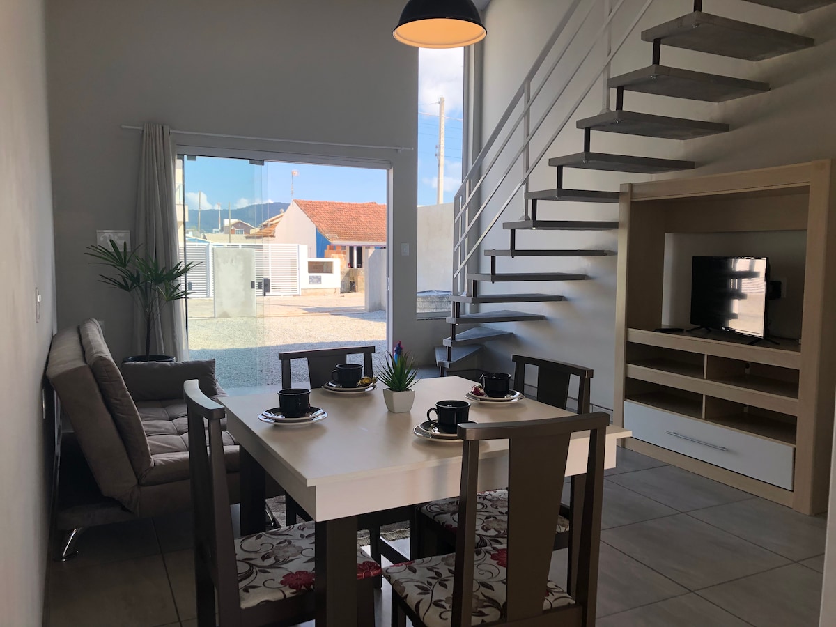Loft B é novo com piscina Possui Wi-Fi Térreo: sala com sofá cama, TV smart e ventilador; banheiro completo; cozinha com fogão, geladeira duplex, micro-ondas, liquidificador, chaleira elétrica e utensílios básicos de cozinha; Área de lazer privativa. 1º piso: Quarto com uma cama de casal e uma cama de solteiro + auxiliar, com ar-condicionado. Temos mercado na rua Padaria próximo Ficamos no meio de duas lindas praias A rua bem tranquila