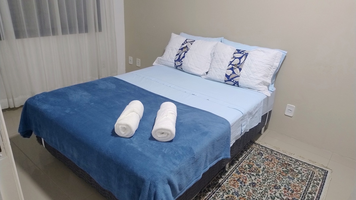 Hospede-se em um apartamento pensado com carinho para oferecer conforto e estilo. Com ar-condicionado nos quartos, cozinha completa e uma TV de 60”, sua estadia será ainda mais agradável. • Quarto 1 (suíte): Possui uma cama queen size, closet amplo e um banheiro completo com chuveiro a gás para seu conforto. • Quarto 2: Espaçoso, com uma cama de casal e espaço dedicado para home office, ideal para quem precisa trabalhar ou estudar durante a estadia. E para seu carro: garagem interna coberta!
