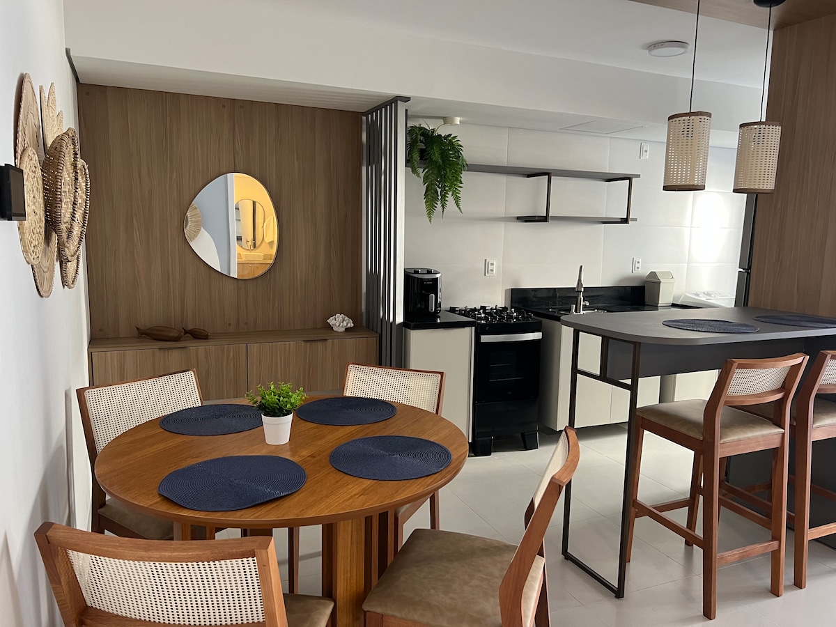Apartamento de excelente padrão, construção nova, com piso flutuante, porcelanato, Tv a cabo (Net), internet e decoração moderna. Localização privilegiada a 100 metros da estátua de Iemanjá e da praia. Conta com uma vaga de estacionamento e espaço gourmet com churrasqueira (do Condomínio). Pátio de estacionamento murado, com cerca elétrica e acesso por portão automatizado. Acomoda até 3 pessoas. Conta com dois ventiladores e todos os utensílios de cozinha.