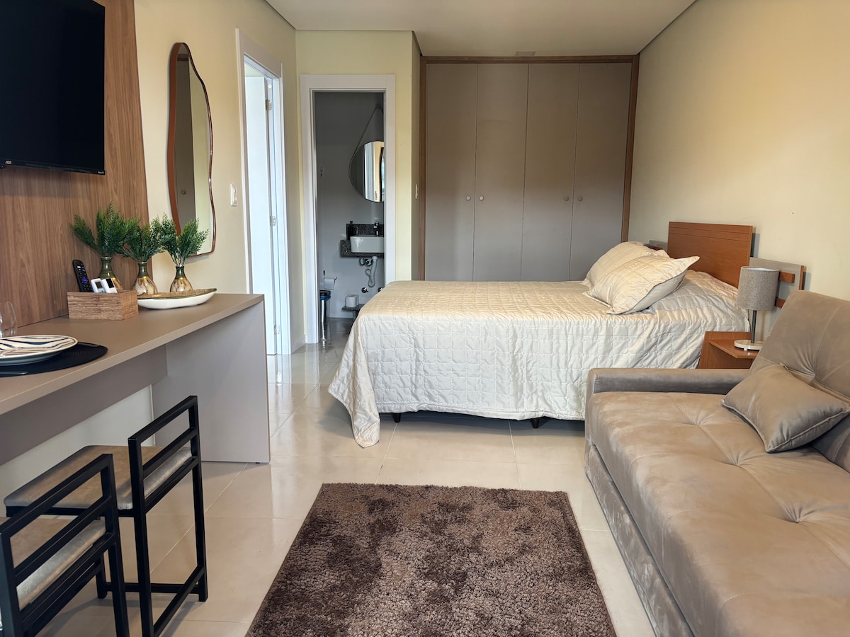 Relaxe em um ambiente descolado. Ideal para casais, grupo de amigos até quatro pessoas ou família pequena. Uma cama de casal super confortável. Com espaço para um colchão de casal ou 2 de solteiro estendidos no piso. Lembre ē um espaço de 52 m2 sem divisões. Super próxima da praia só quatro quadras no ABC IX . Otima localização para banho.