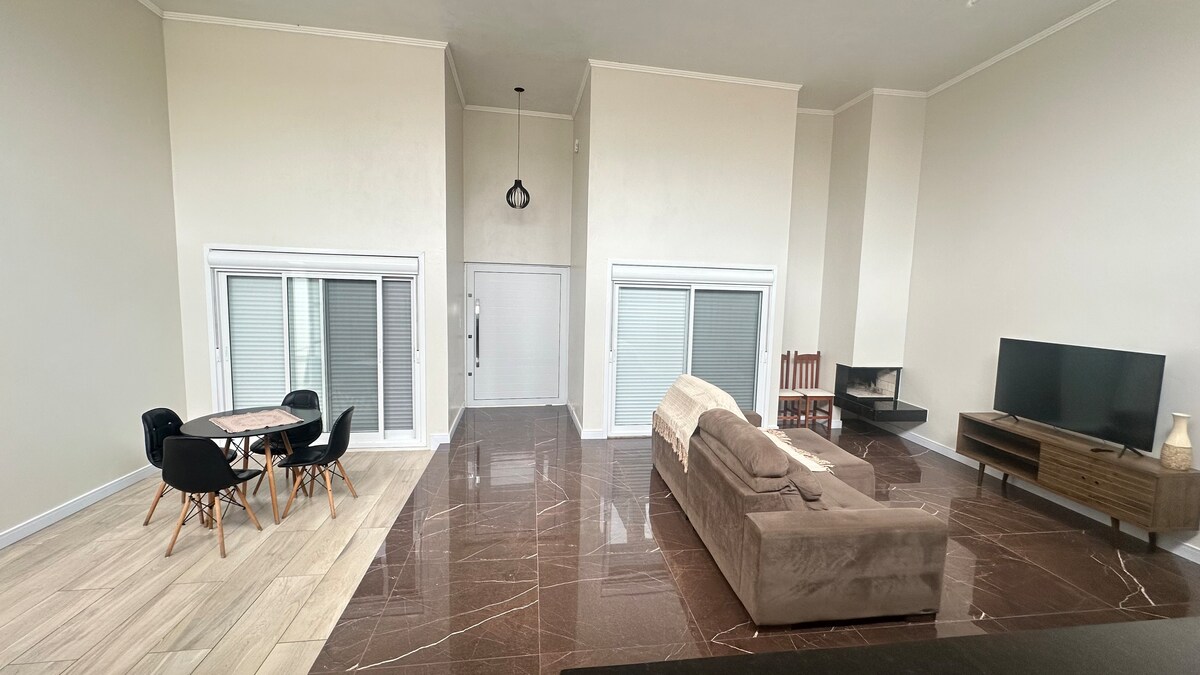 Apto com lareira e varanda grande para relaxar
