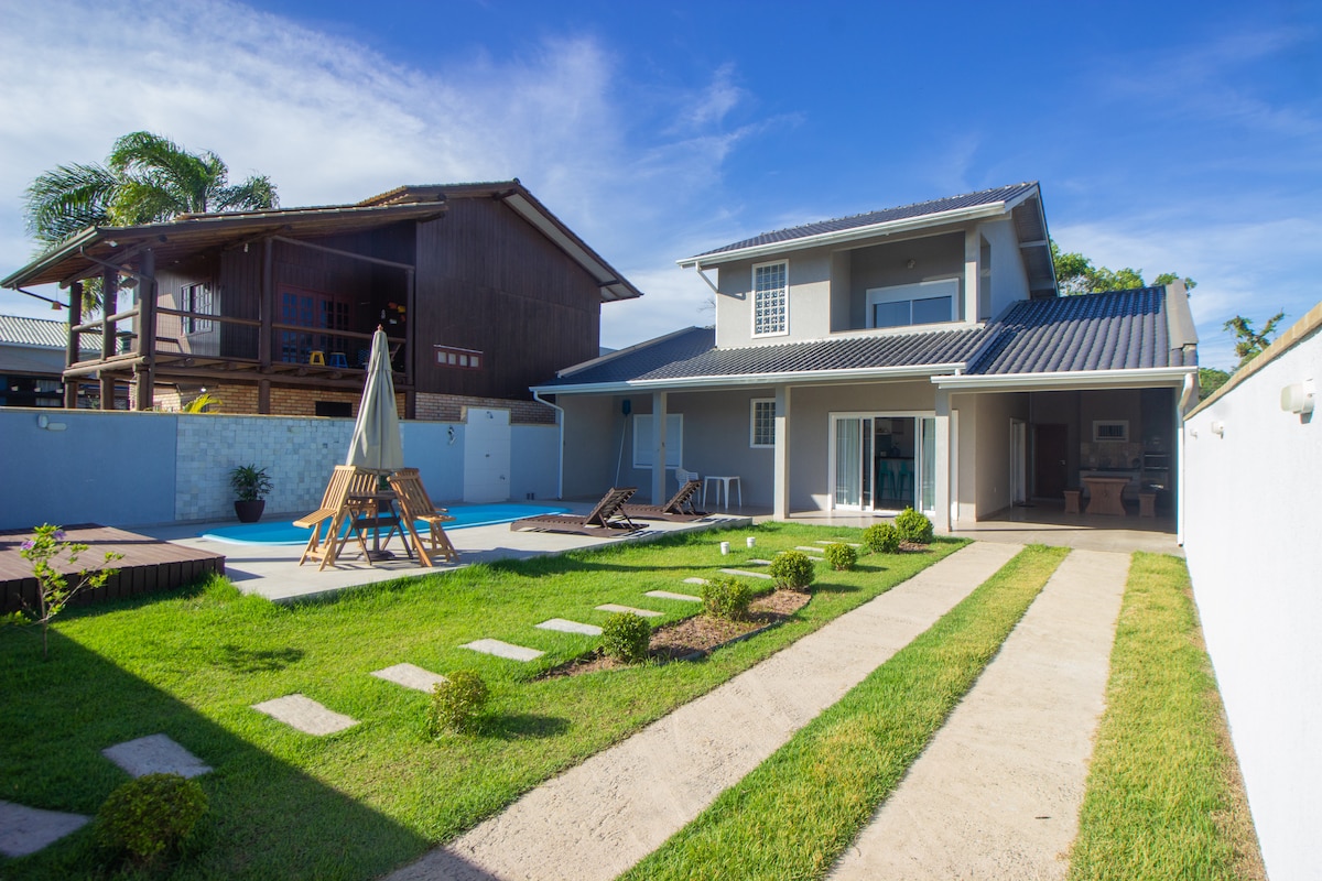 Já pensou em se hospedar em um local com o conforto de uma pousada e a privacidade da sua própria casa? Este lugar é aqui! Casa recém construída com churrasqueira à carvão, cervejeira, piscina aquecida, espreguiçadeiras, mesa de ping-pong, bicicletas, traves de futebol, rede para descanso, ar condicionado, ducha aquecida e eletrodomésticos. Localizada à 250 mt da praia de Canto Grande e 650 mt da de Mariscal. O paraíso te espera!