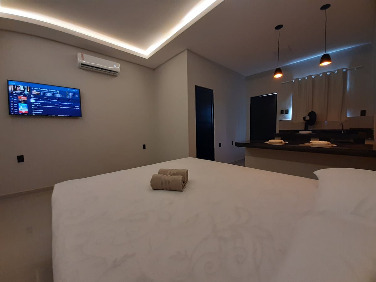 Jardim do Éden – Morada 3: Apartamento duplo premium localizado em área tranquila com ar-condicionado digital, chuveiro elétrico, cama queen size, TV Smart 43”, frigobar de 45L e iluminação LED quente e branca. Possui banheiro com blindex, cozinha compacta equipada (cooktop duplo, utensílios básicos de cozinha), além de sanduicheira, ferro elétrico e ventilador, área externa com tanque e espaço para secagem, lavanderia comum e opção de estacionamento pago.