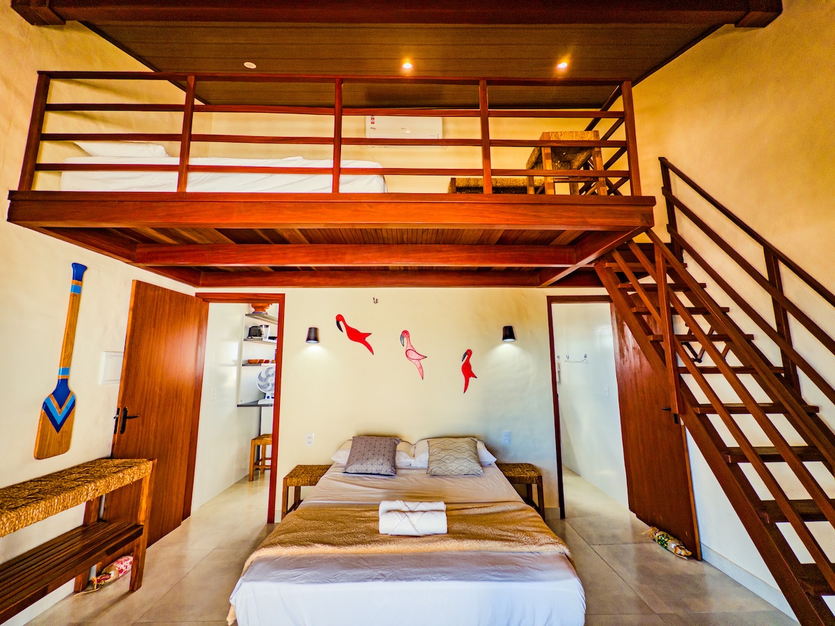 A quiet place, ideal for relaxing and connecting with nature. The paradisiacal Maramar Beach is just 200 meters from the condominium. In the Studio: — Stunning sea view — Double bed + double mattress in the mezzanine — Air-conditioning — Balcony with a flawless sunset over the sea — Bed linens and towels included — Complete compact kitchen Condominium common areas: — Swimming pool — Hot tub — Gourmet area with barbecue grill
