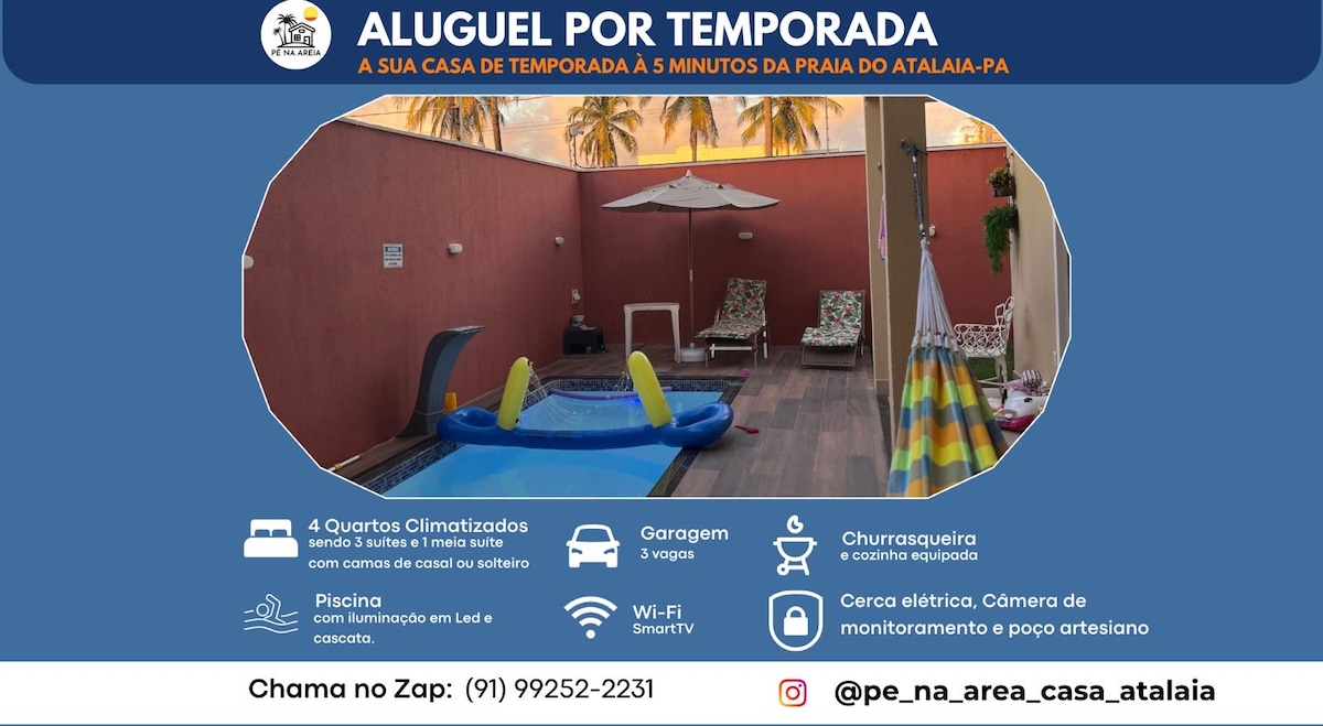 Casa em Salinópolis com Piscina e Churrasqueira Acomoda até 15 pessoas, sendo 12 em camas (camas de casal e beliches) e 3 em colchões extras. Localizada a 500 metros da Praia do Atalaia e em frente à Tudo Conveniência. A casa conta com 3 suítes, todas as suítes com ar-condicionador e 1 Quarto, cozinha completa (geladeira, fogão, armários, louças e panelas), área de lavanderia, garagem para 4 carros e Wi-Fi grátis. Ideal para famílias e grupos que buscam conforto, lazer e proximidade da praia.