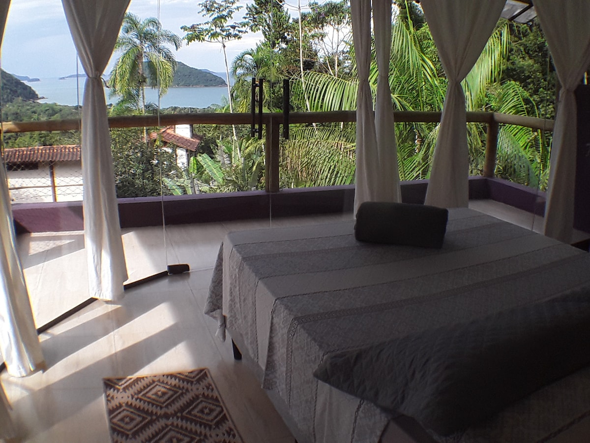 a casa fica em meio a Mata Atlantica, com uma vista incrível, de todos os ambientes da casa, inclusiveda suíte redonda de vidro, voce tem a vista do mar e ilhas e ainda conta com um barulhinho da cachoeira para dormir a casa possui uma suíte de vidro redonda e 2 varandas na parte superior, na parte de baixo lavabo, sala, cozinha completa e deck externo