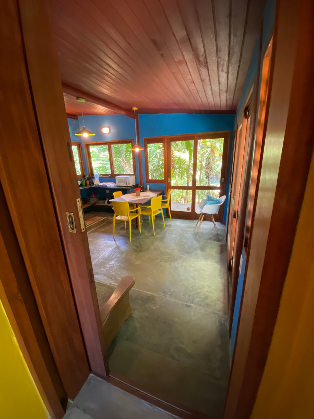 Todos os nossos chalés são privativos, com banheiro, cozinha completa, TV Smart e Wi-fi 300mb, o que permite você trabalhar caso precisar. Também temos ventilador de teto nos quartos e varanda privativa com vista para as montanhas. No geral o chalé é simples mas aconchegante, ideal para quem procura um lugar sossegado próximo a praia e rodeado por natureza, sem muito luxo e com um ótimo custo benefício.