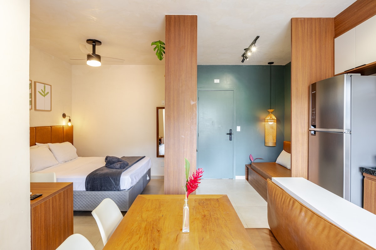 Studio novo com projeto assinado por arquiteta, muito lindo e confortável. Está à 400m da Orla da Praia do Perequê Açú. Contamos com: TV smart, Wi-fi de fibra ótica, espaço próprio para trabalhar, cozinha equipada, churrasqueira na varanda e uma vista deslumbrante da Mata Atlântica. No prédio temos piscina, forno para pizza, ducha e garagem com portão eletrônico. Está muito bem localizado, perto do Centro e Rua Turística, além da Rodovia.