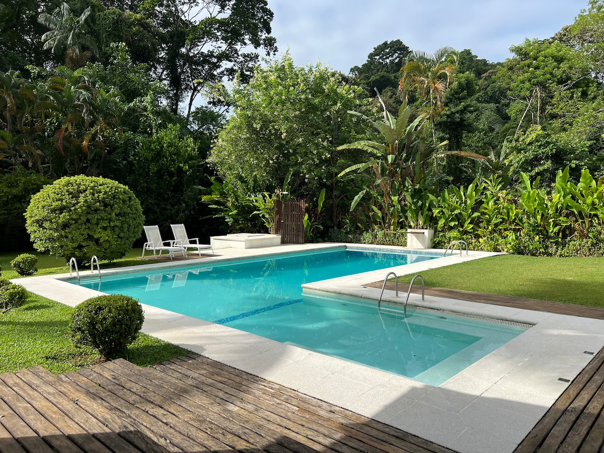 A place with the most incredible view of the sea, views of Flamengo Bay, Anchieta Island, Santa Rita Beach, Lamberto, Ribeira and others… With a private trail in the Atlantic Forest, 2 incredible viewpoints, small waterfalls with crystal clear water! With security and privacy, the Greece-themed house has a comfortable and structured 300m2, airy and fresh and with new air conditioning in all bedrooms. The closest beach is Lamberto Beach, you have to walk 400m, but we recommend going by car!