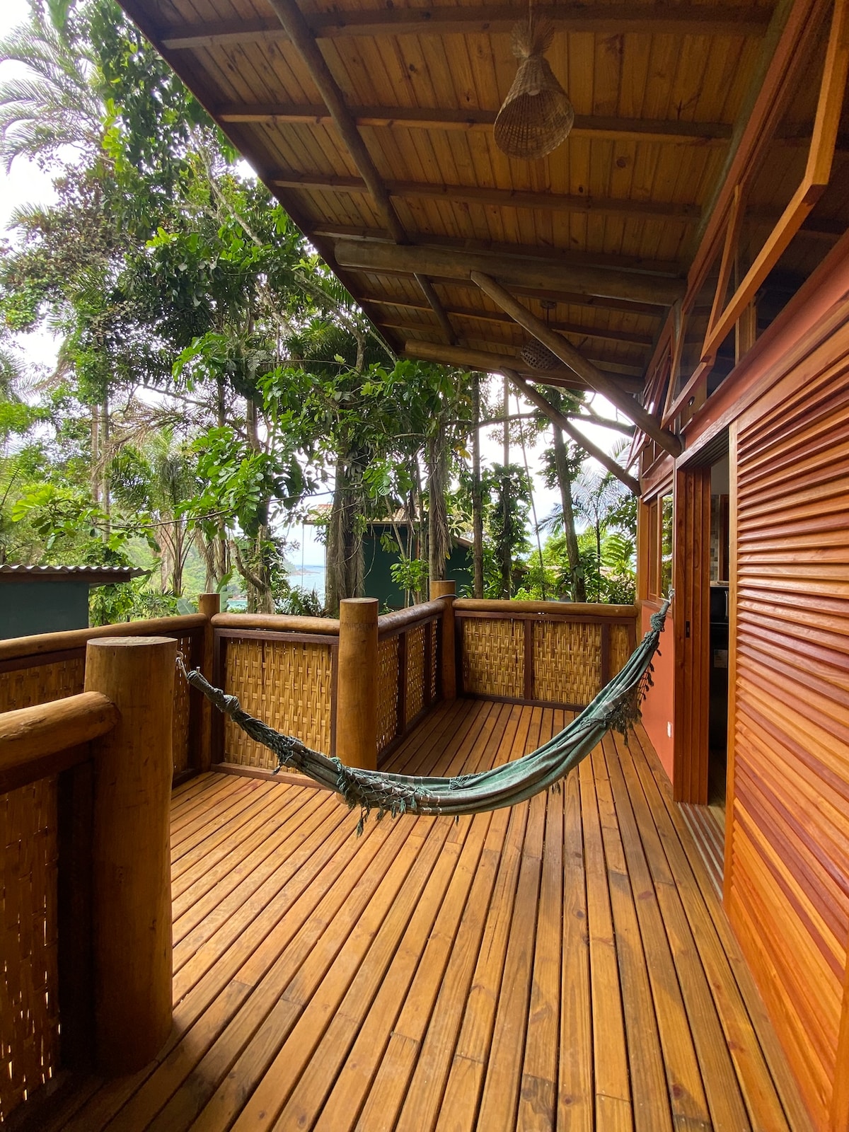 Todos os nossos chalés são privativos, com banheiro, cozinha completa, TV Smart e Wi-fi 300mb, o que permite você trabalhar caso precisar. Também temos ventilador de teto nos quartos e varanda privativa com vista para as montanhas. No geral o chalé é simples mas aconchegante, ideal para quem procura um lugar sossegado próximo a praia e rodeado por natureza, sem muito luxo e com um ótimo custo benefício.